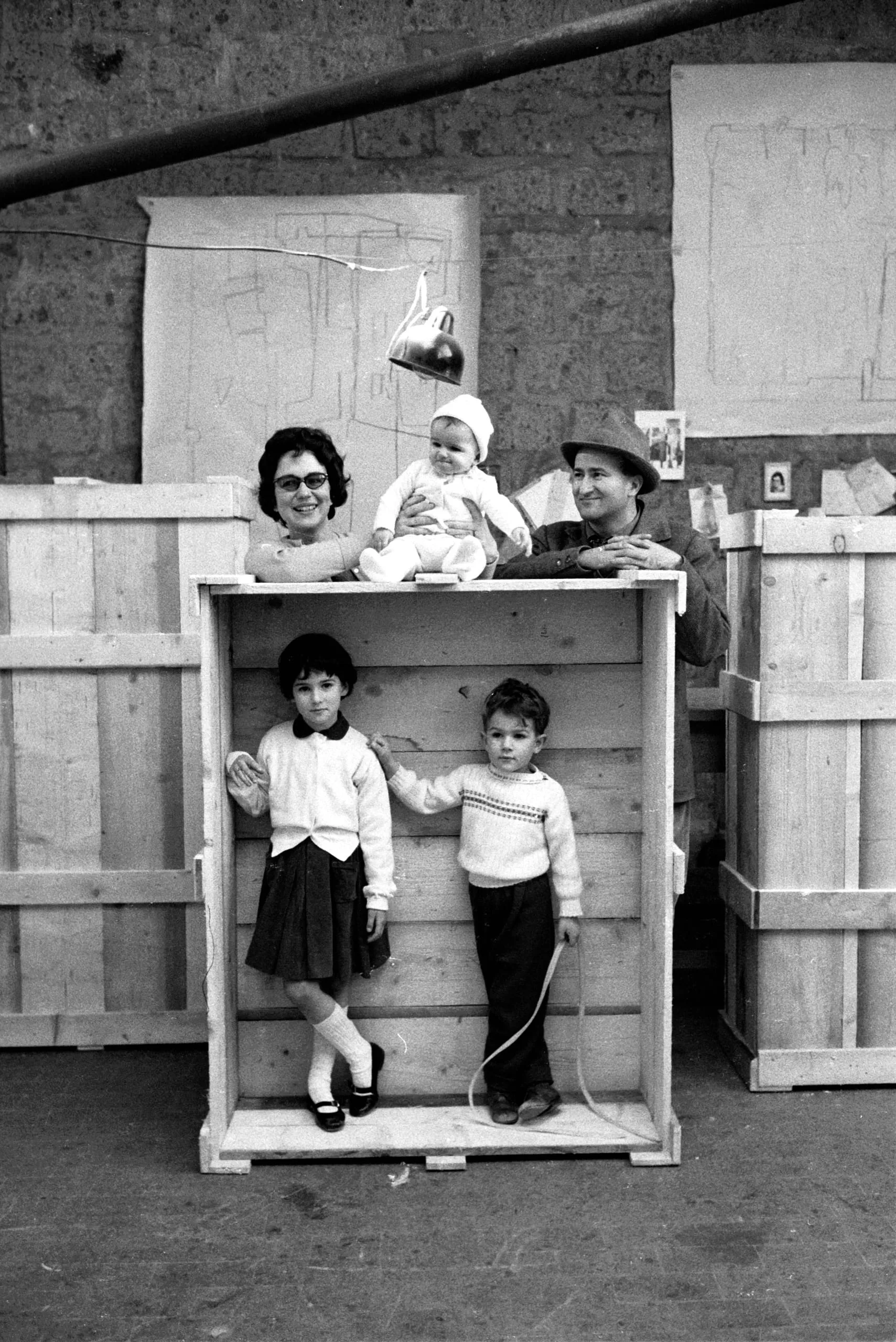 Black and white photograph of two adults and three children posed in and around a large open wooden crate in a warehouse, with soft diffused lighting