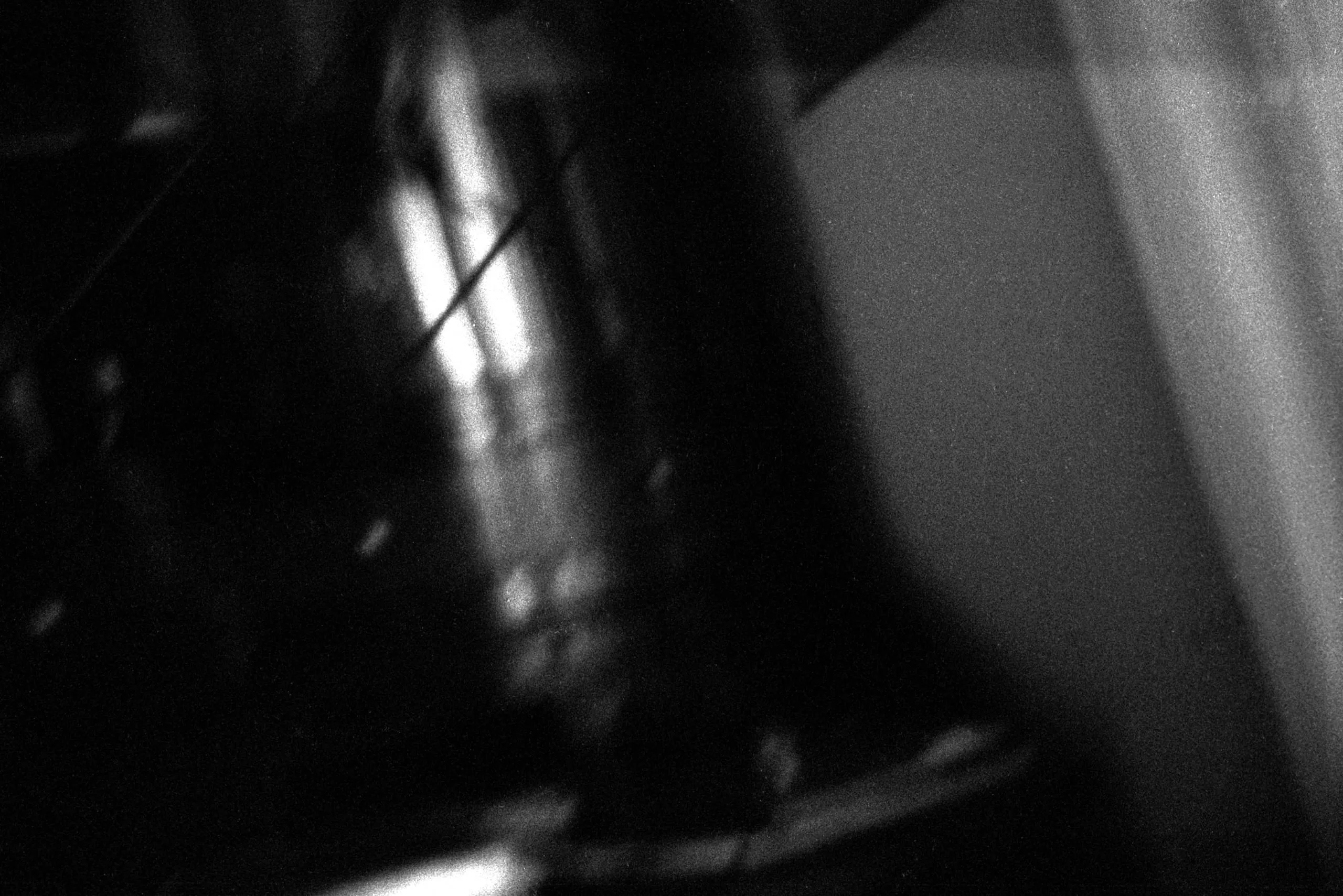 Black and white photograph, heavily blurred, with a cylindrical form at center crossed by diagonal streaks of light against deep black and gray tones