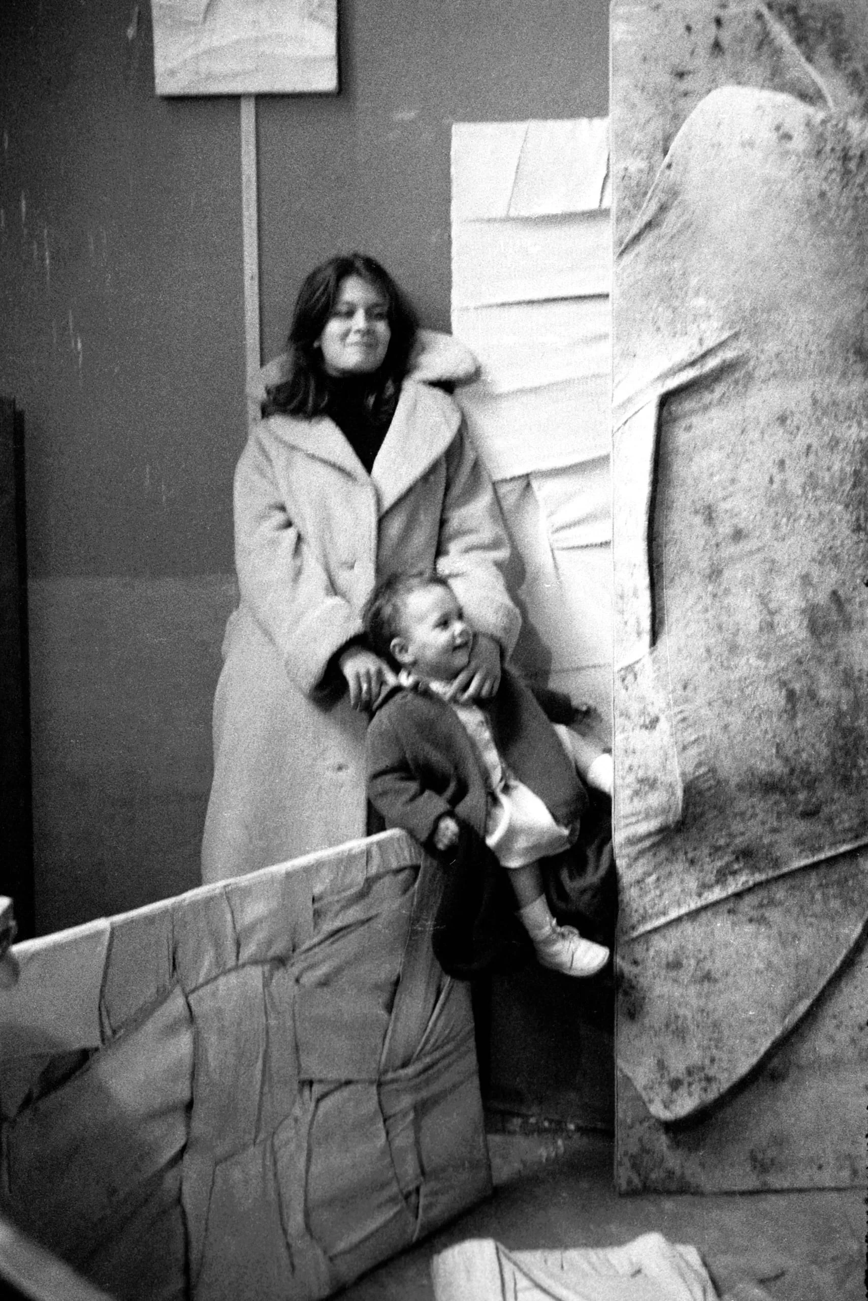 Black and white photograph of a woman in a long coat holding a toddler, surrounded by large rough sculptural slabs in a studio