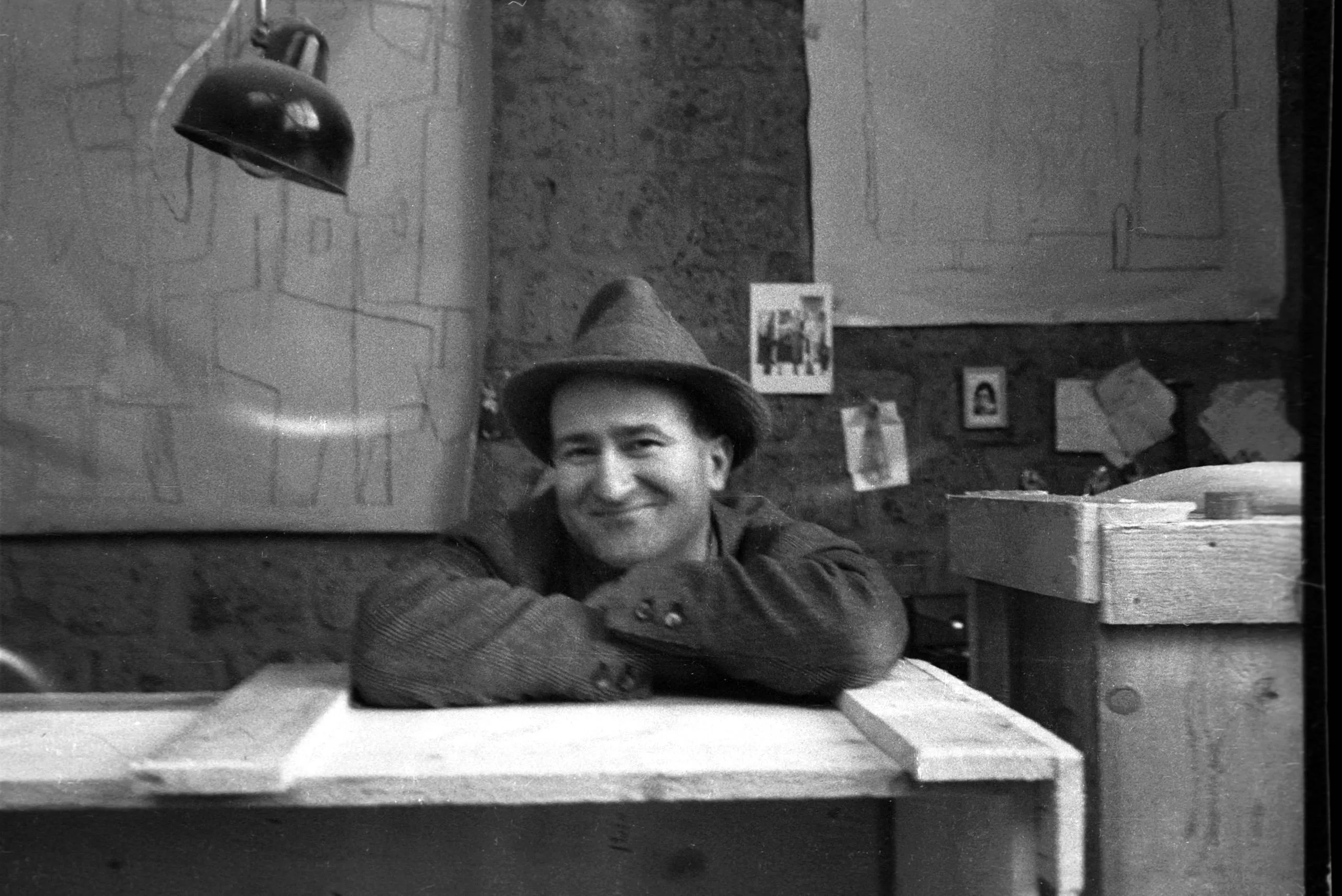Black and white photograph of a smiling man in a wide-brimmed hat, chin resting on crossed arms over a wooden workbench, with sketched canvases on a brick wall behind him