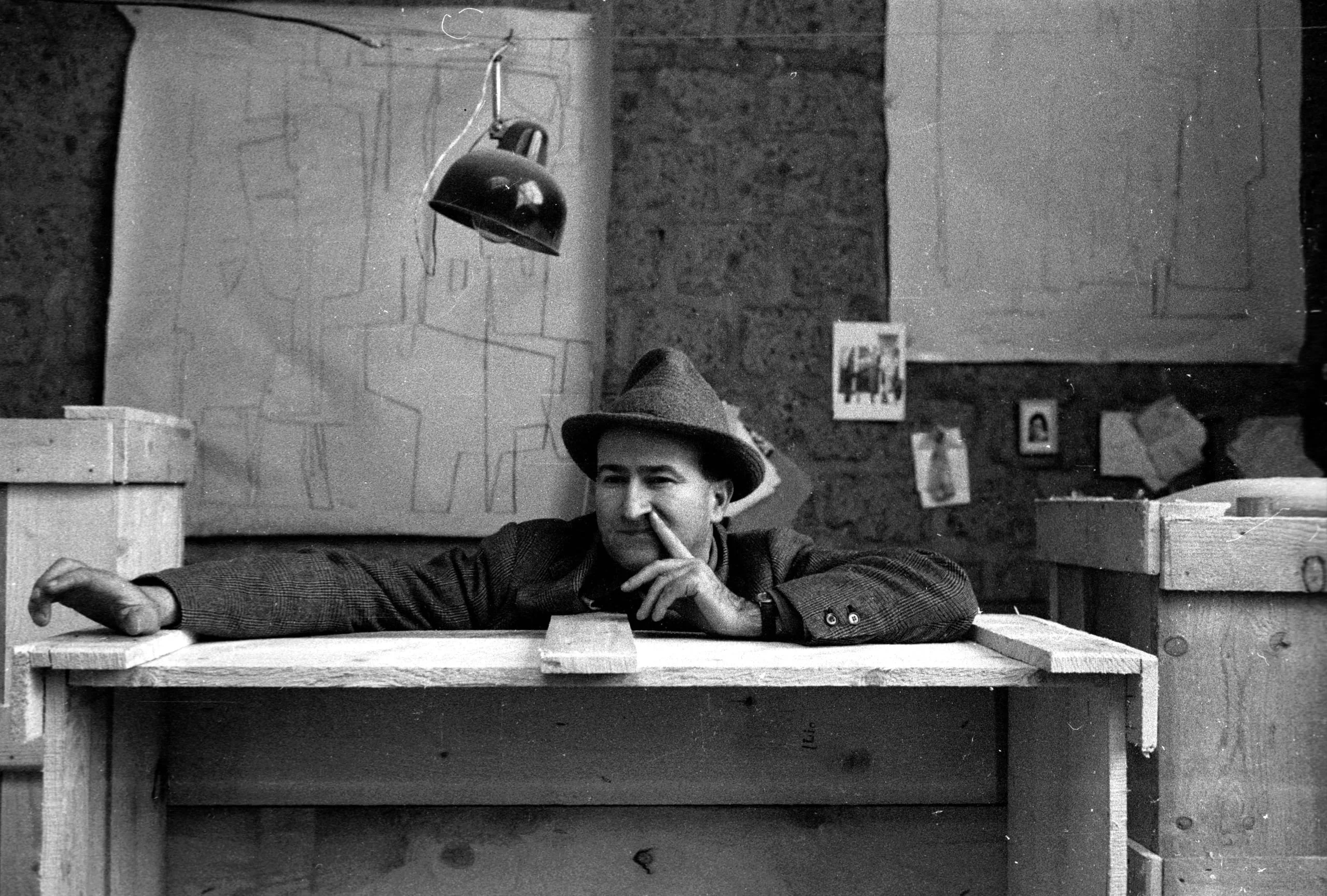 Black and white photograph of a man in a felt hat leaning over a wooden crate in a studio, resting his chin on his hand, with sketched drawings pinned to the wall behind him