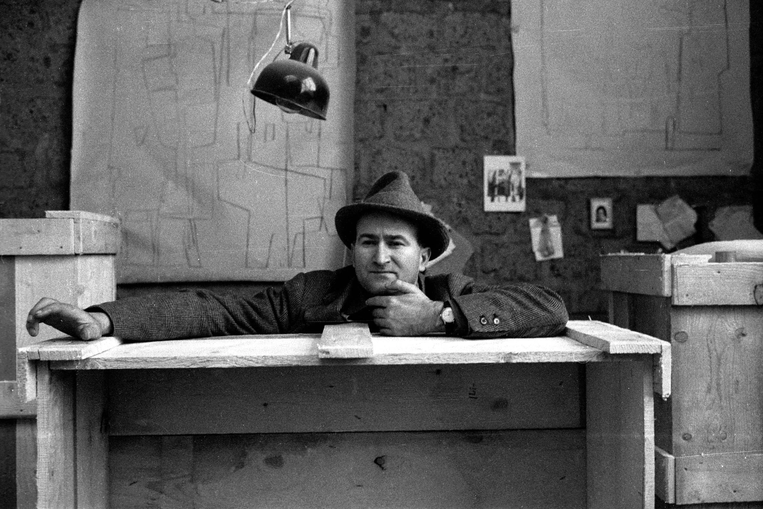 Black and white photograph of a man in a felt hat and tweed jacket leaning chin-in-hand over a rough wooden crate, abstract drawings pinned to a brick wall behind him