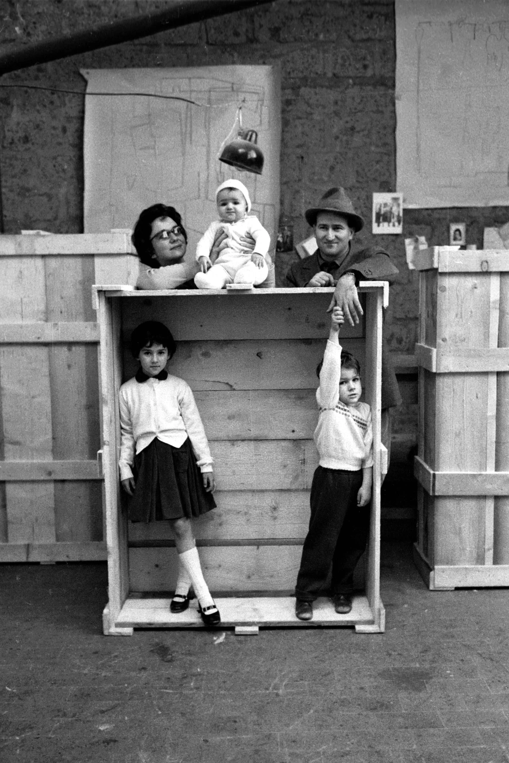 Black and white photograph of two adults and three children posed inside and around a large open wooden crate in a warehouse setting