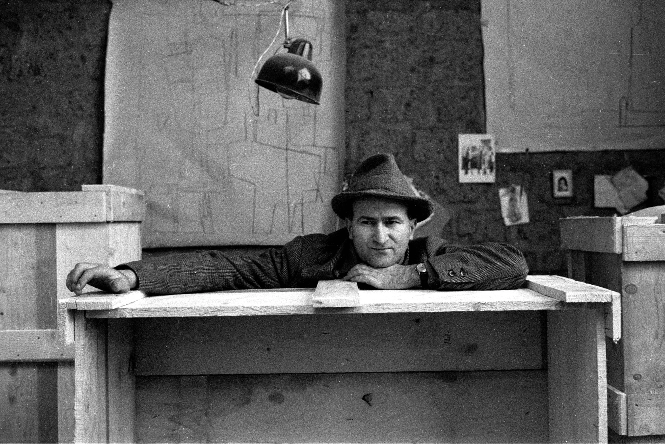 Black and white photograph of a man in a wide-brimmed hat leaning chin-on-hands over a rough wooden crate, with a sketched canvas and studio wall behind him
