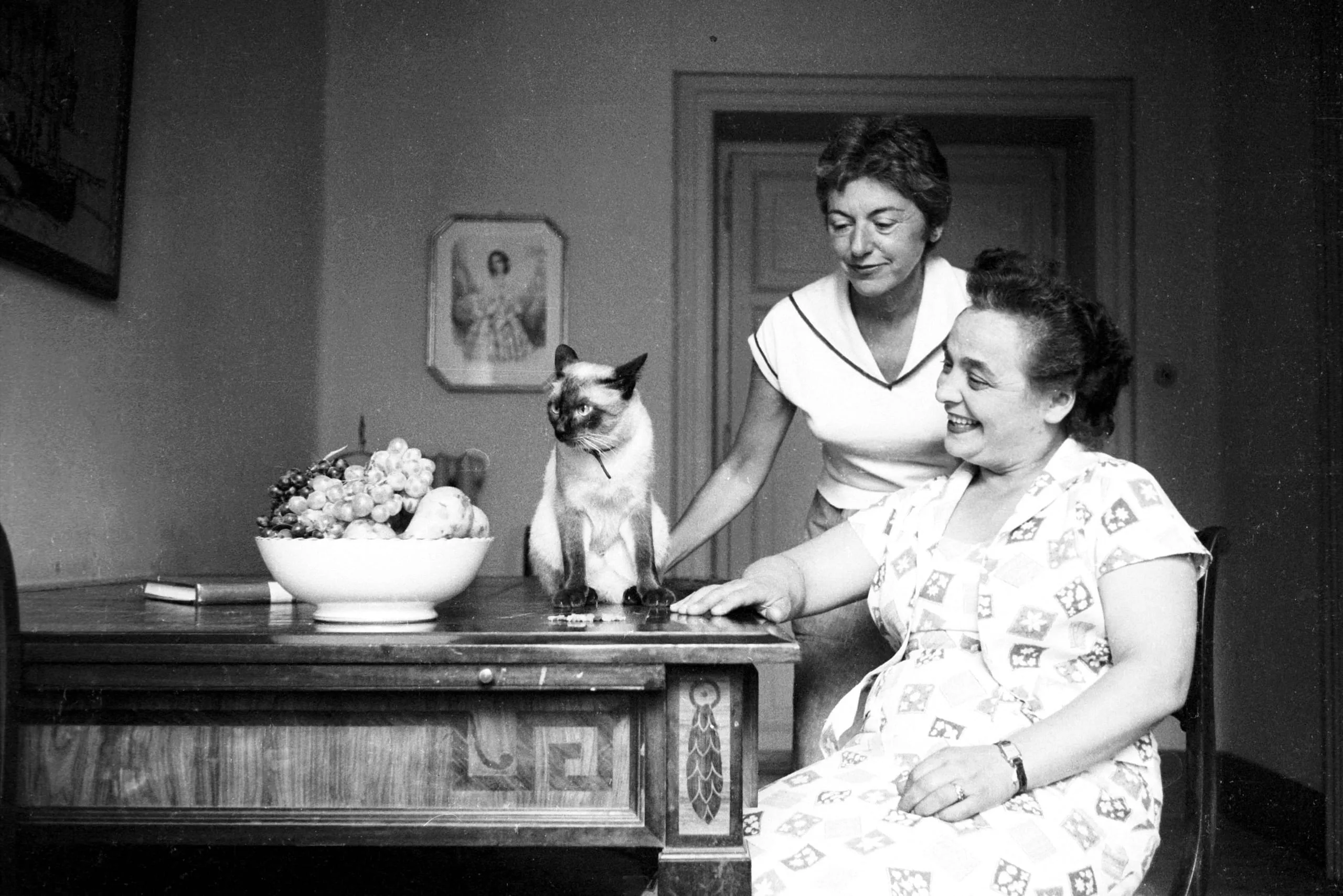 Black and white photograph of two women and a Siamese cat at a wooden table indoors, with a bowl of fruit to one side