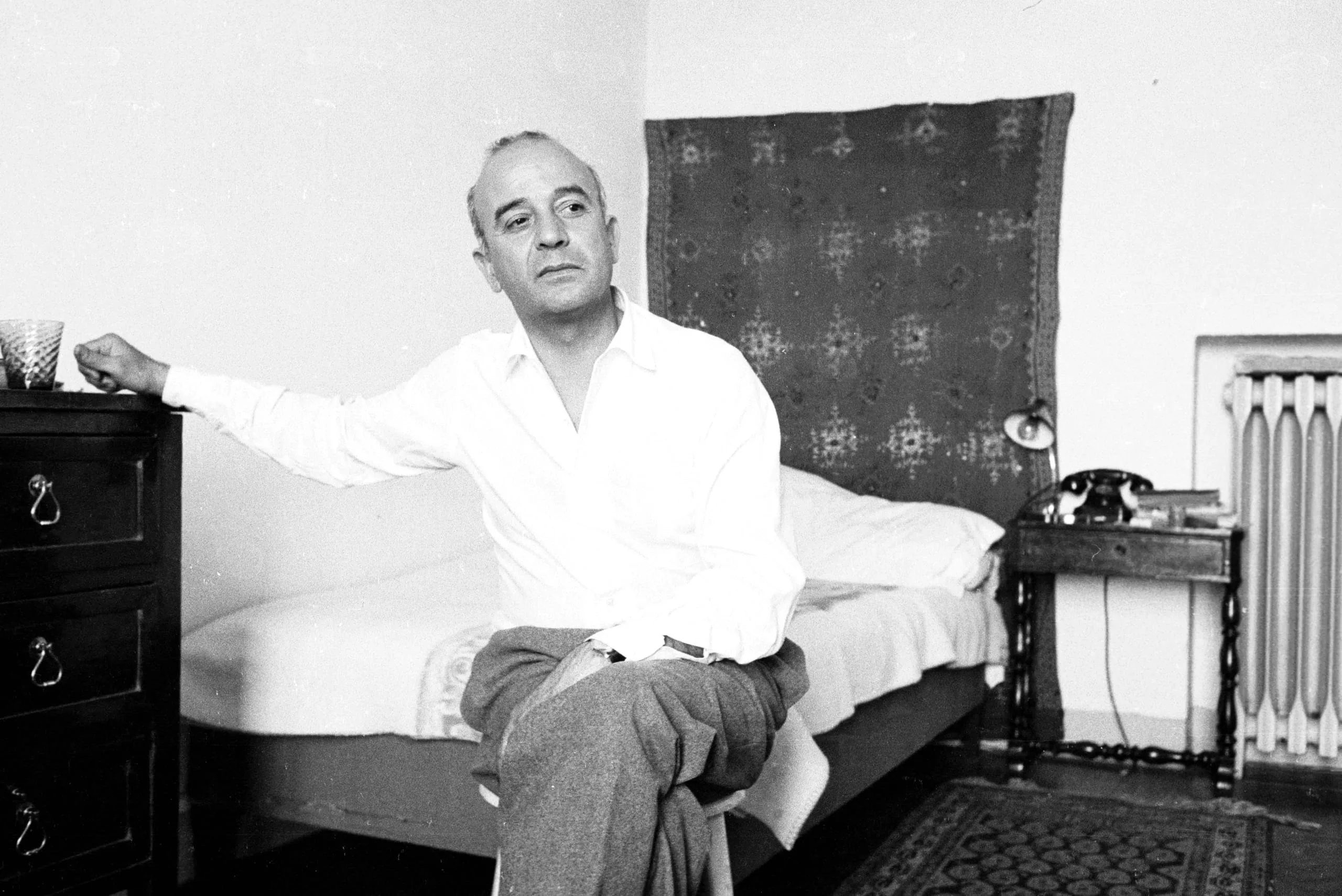 Black and white photograph of a man in a white shirt seated on a bed's edge, one arm outstretched to a dresser, in a simply furnished room
