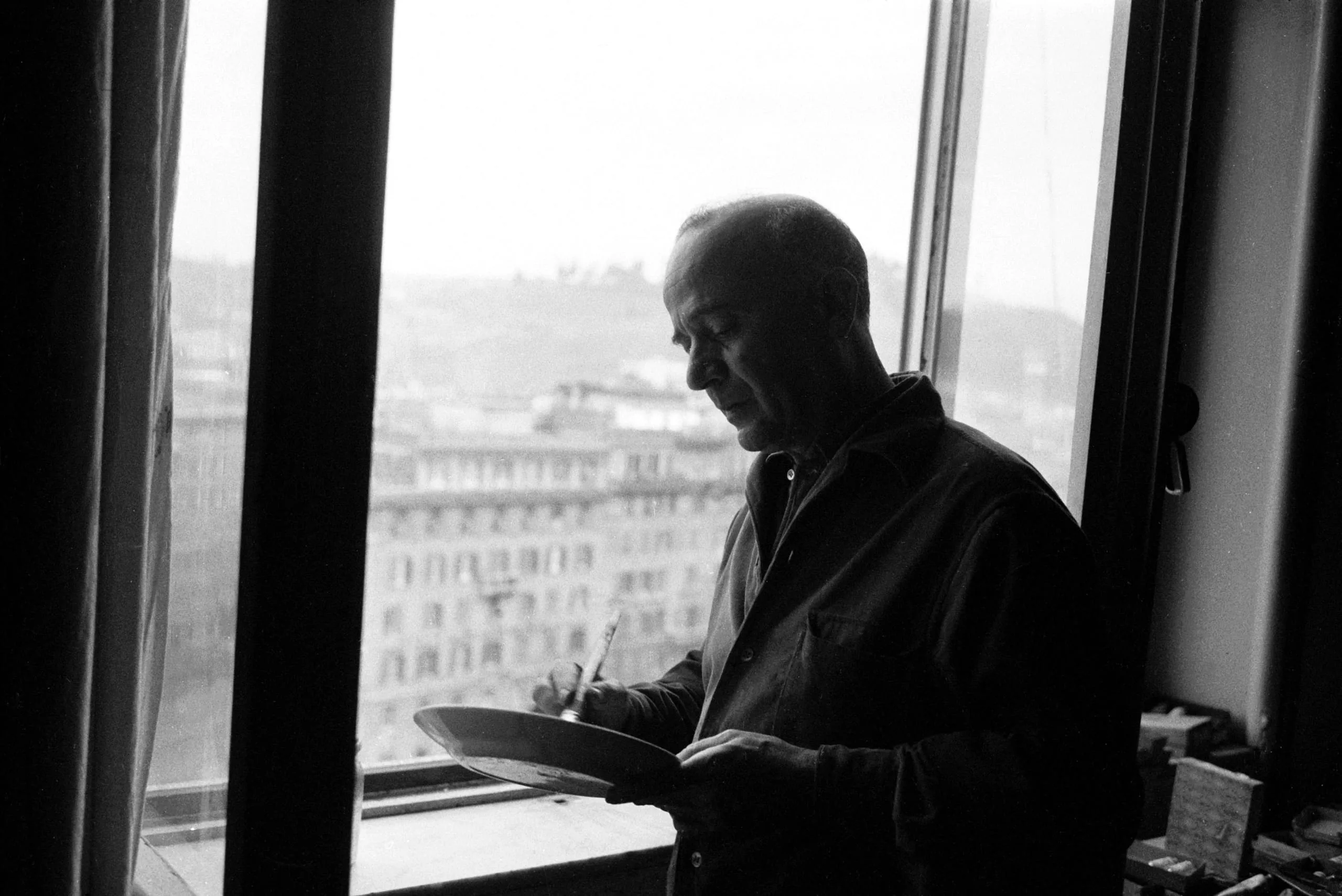 Black and white photograph of a man in silhouette holding a paint palette and brush before a large window overlooking a city skyline