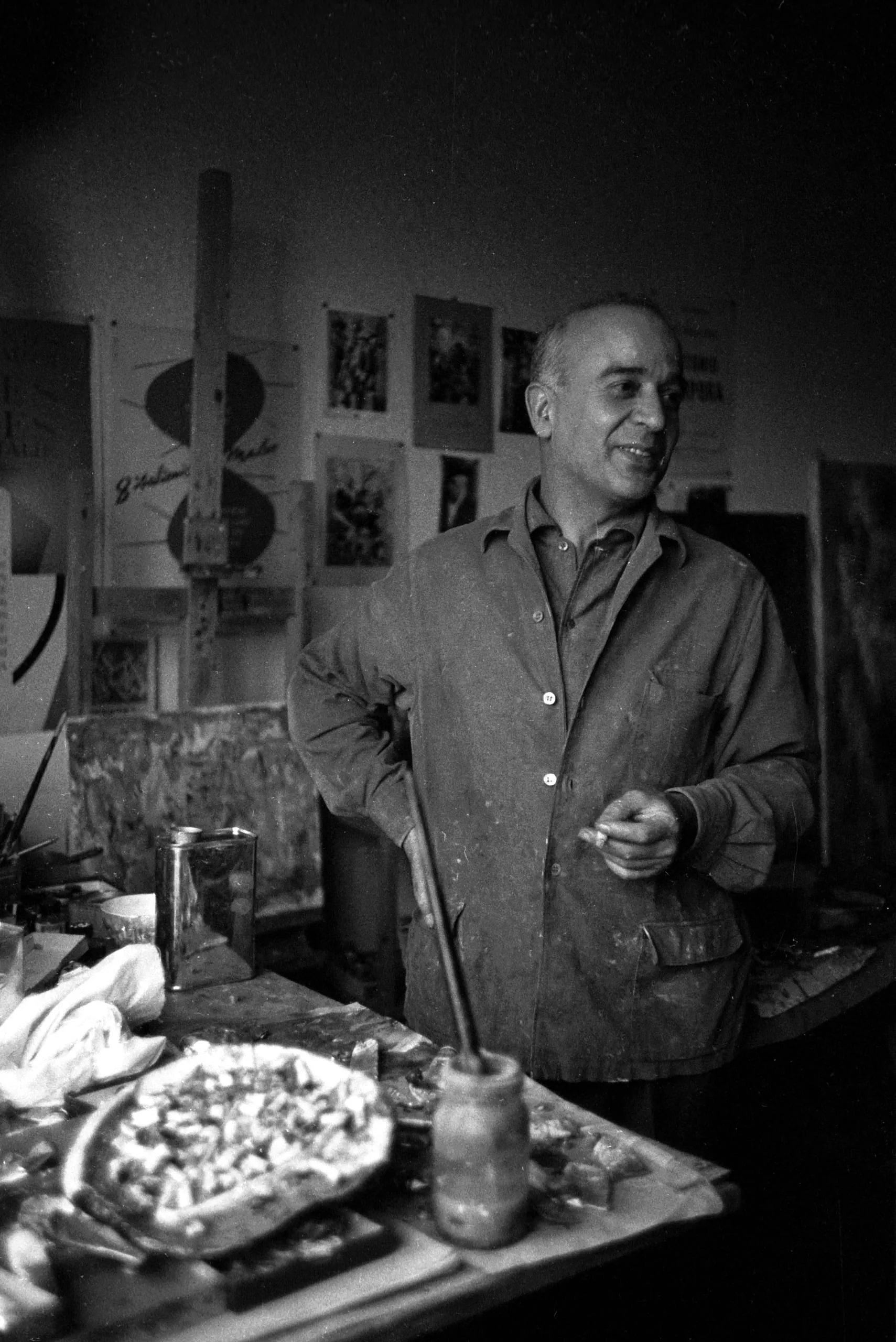 Black and white photograph of a man in a paint-stained work shirt standing in an artist's studio, smiling and looking to one side, with a palette and brushes on a table in front of him