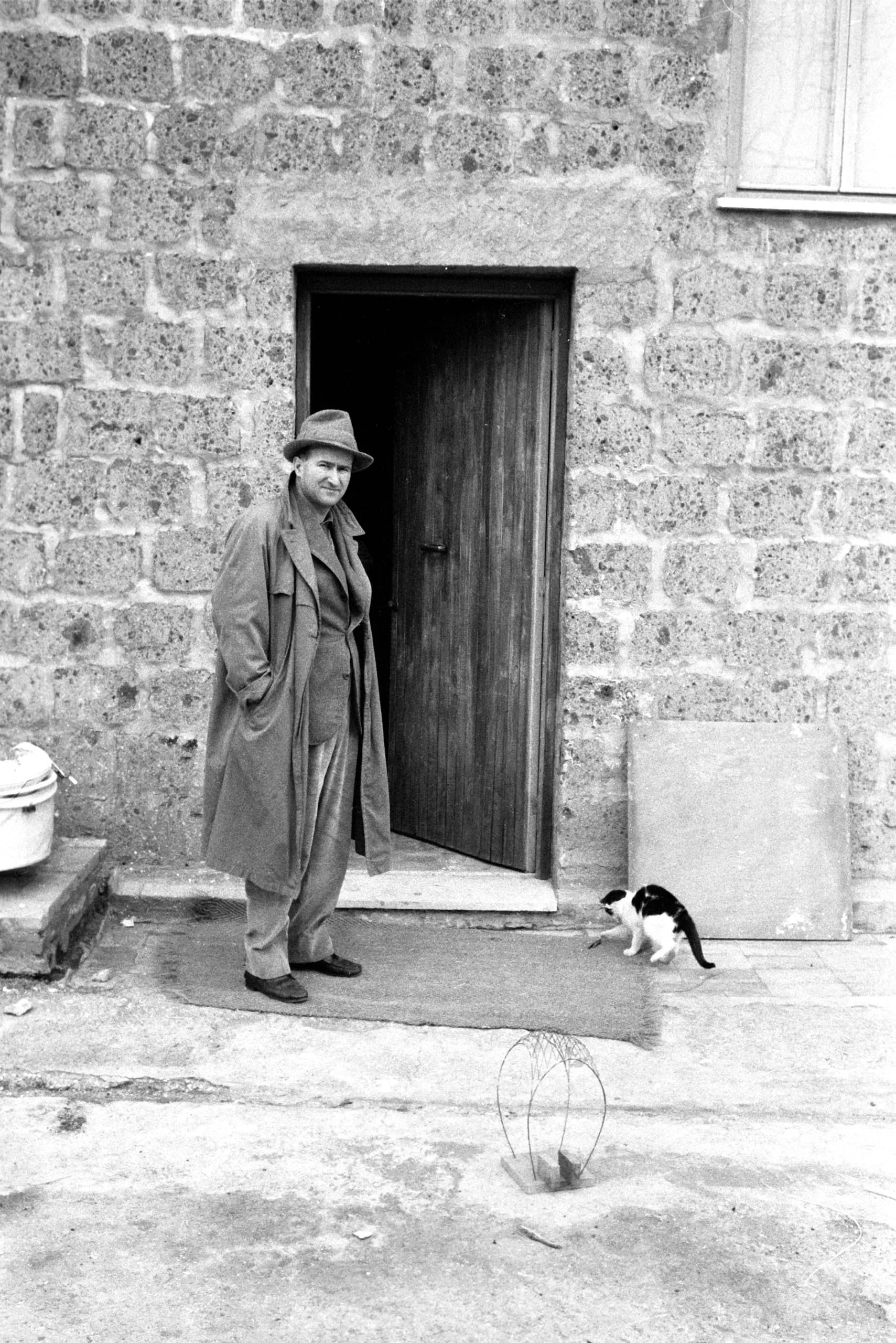 Black and white photograph of a heavyset man in a long overcoat and fedora standing before an open door in a stone building, with a black and white cat beside him and a small wire sculpture in the foreground