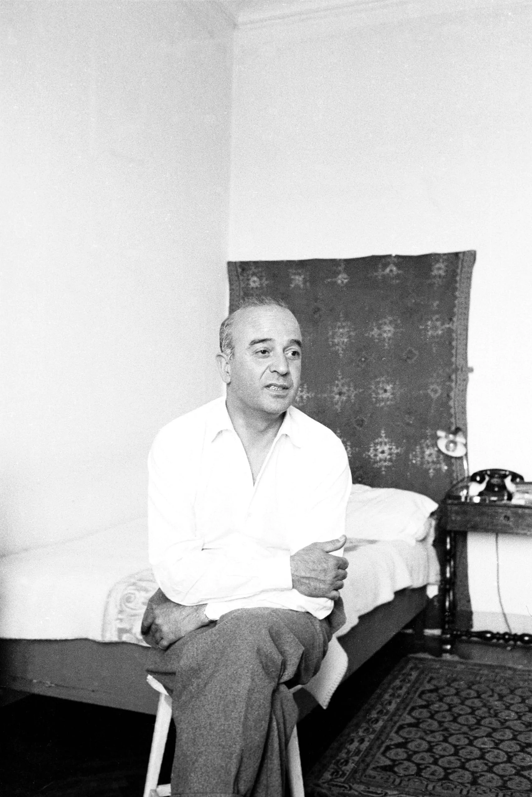 Black and white photograph of a middle-aged man seated on the edge of a bed in a simply furnished room, wearing a white open-collar shirt, looking toward the camera