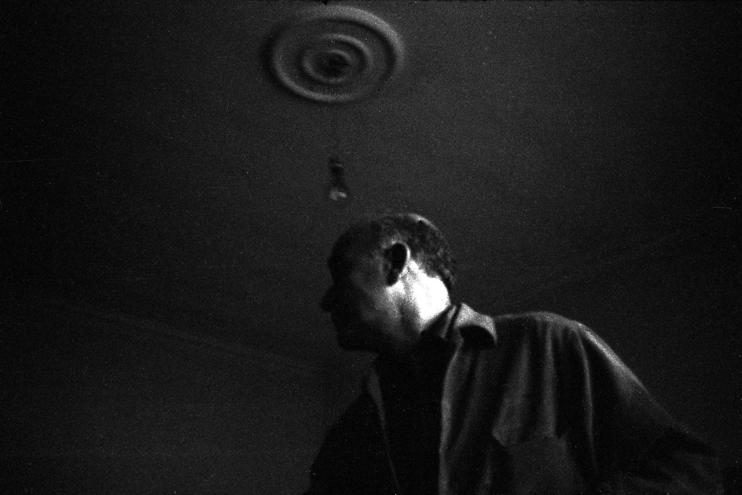 High-contrast black and white photograph of a man in profile, lit sharply from the left, with a circular ceiling medallion visible above in deep shadow
