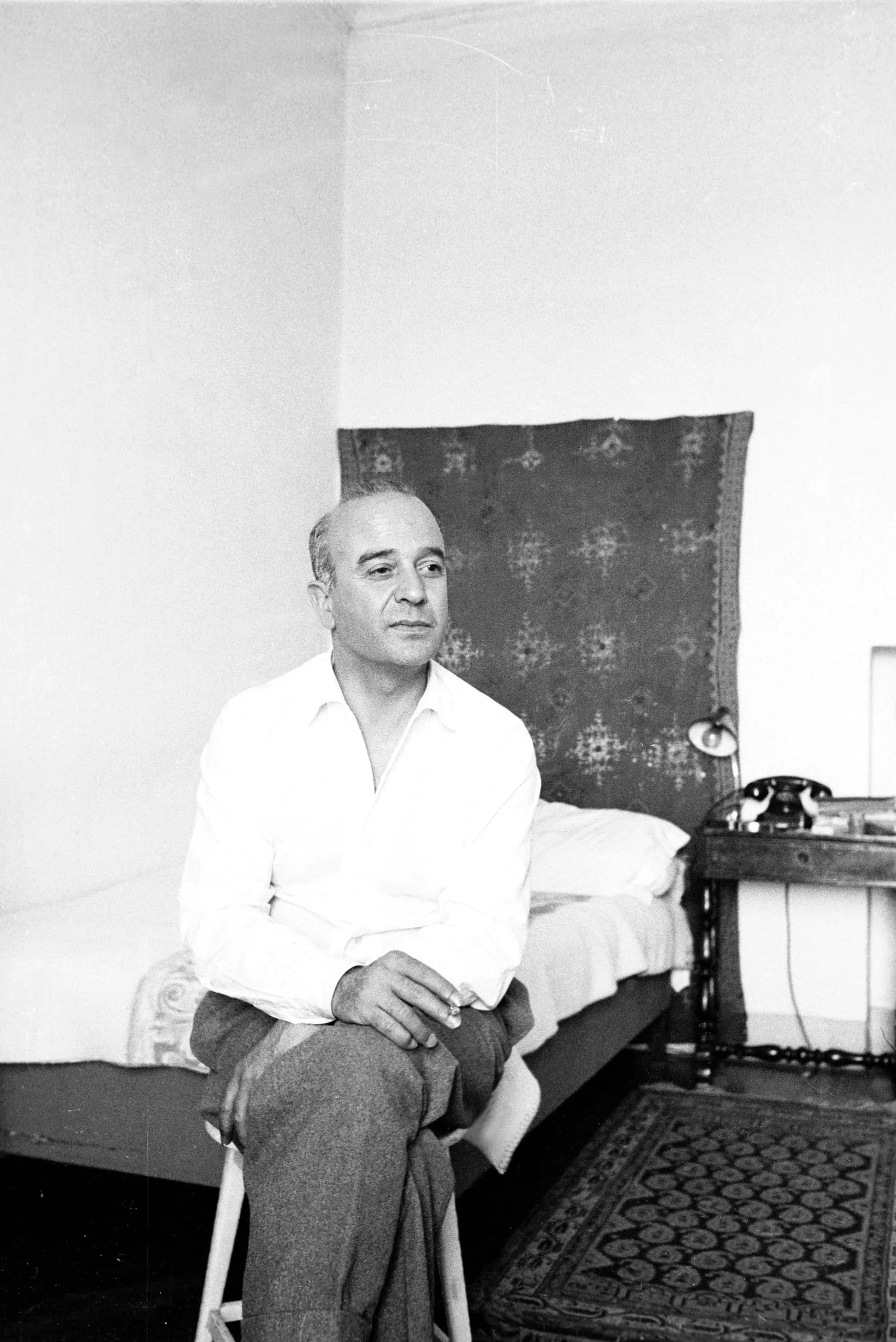 Black and white photograph of a middle-aged man seated on a low stool, body turned slightly toward us, gaze directed off to the left, holding a cigarette, with a made bed and patterned wall hanging behind him