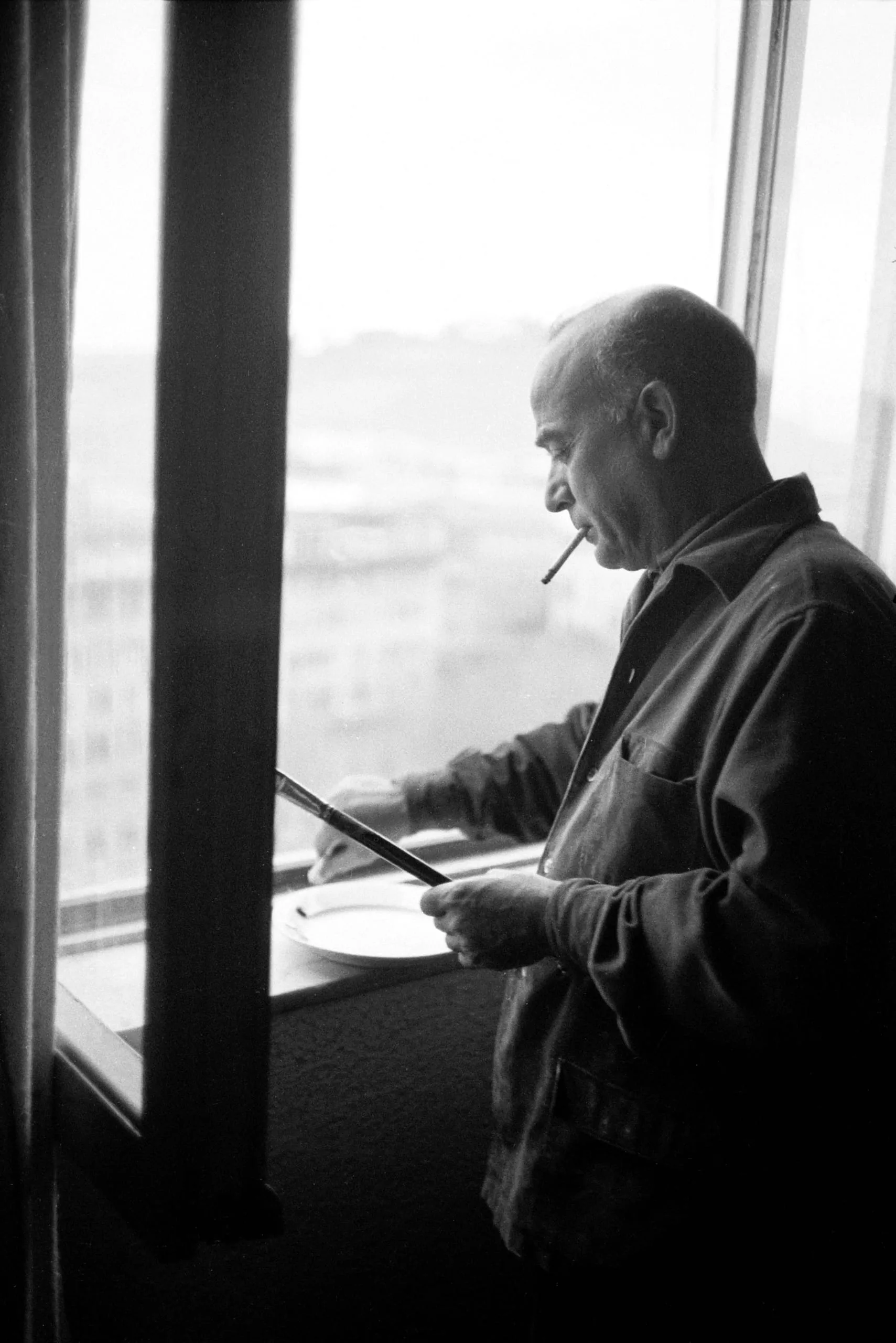Black and white photograph, bald man in profile holding a clipboard and plate near a bright window, cigarette in mouth, city skyline visible in the distance