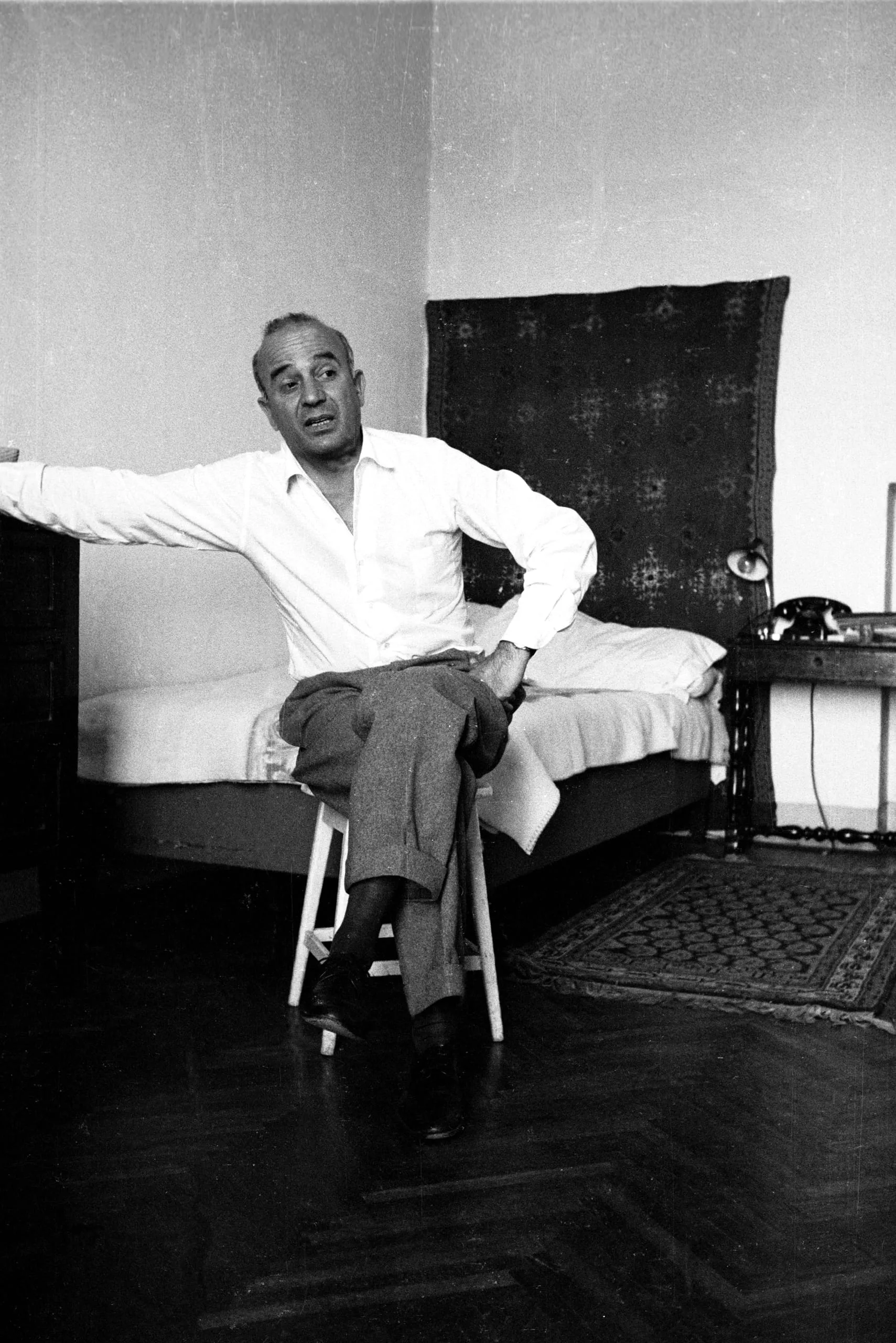 Black and white photograph of a middle-aged man in a white shirt and gray trousers seated on a low stool in a bedroom, arm outstretched, mouth open mid-speech