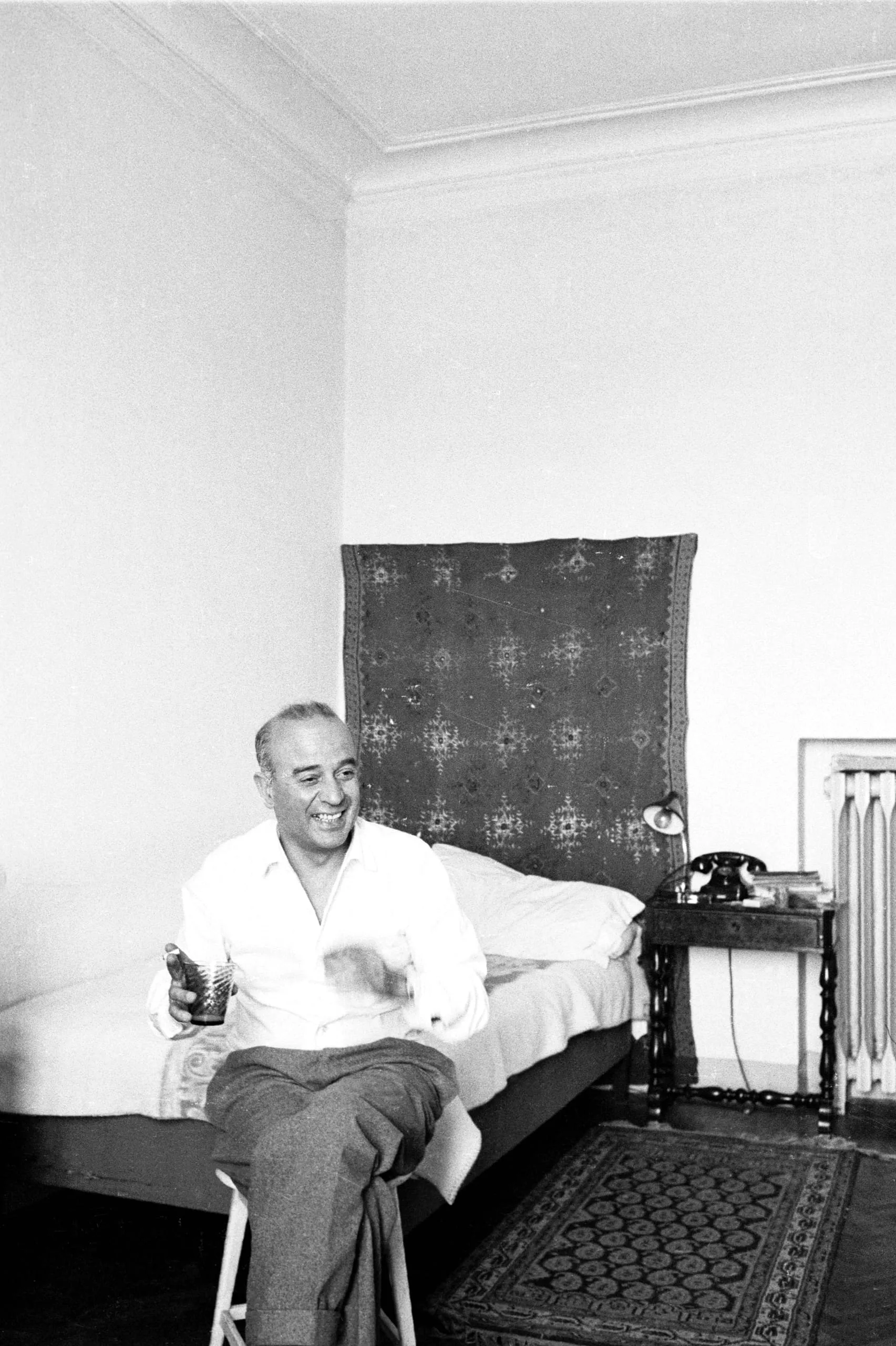 Black and white photograph of a smiling man in a white shirt and gray trousers seated on a bed, holding a small glass, with a patterned textile hung on the wall behind him