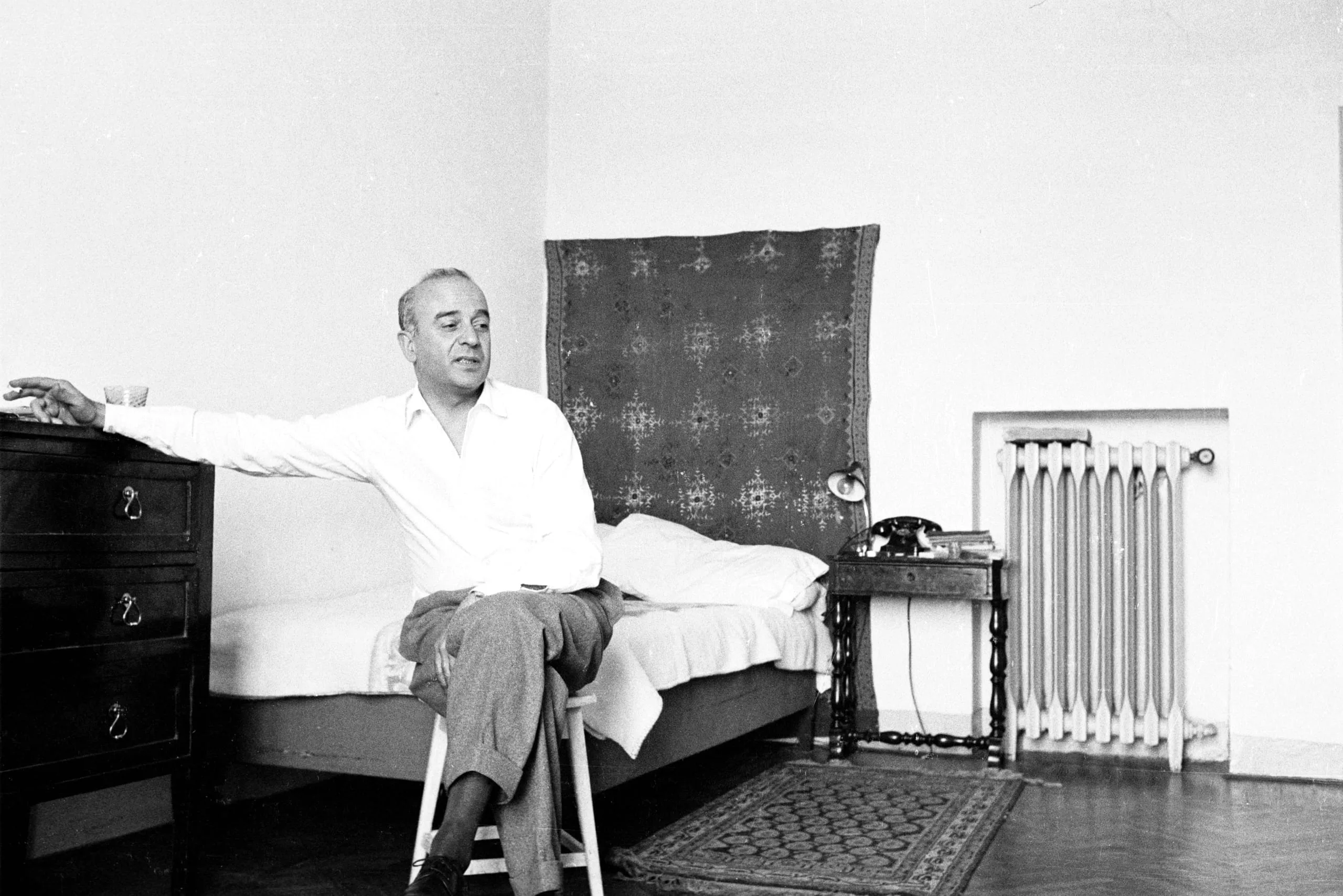 Black and white photograph of a heavyset man in an open-collar shirt seated on a stool beside a single bed, arm outstretched to a chest of drawers, in a simply furnished room