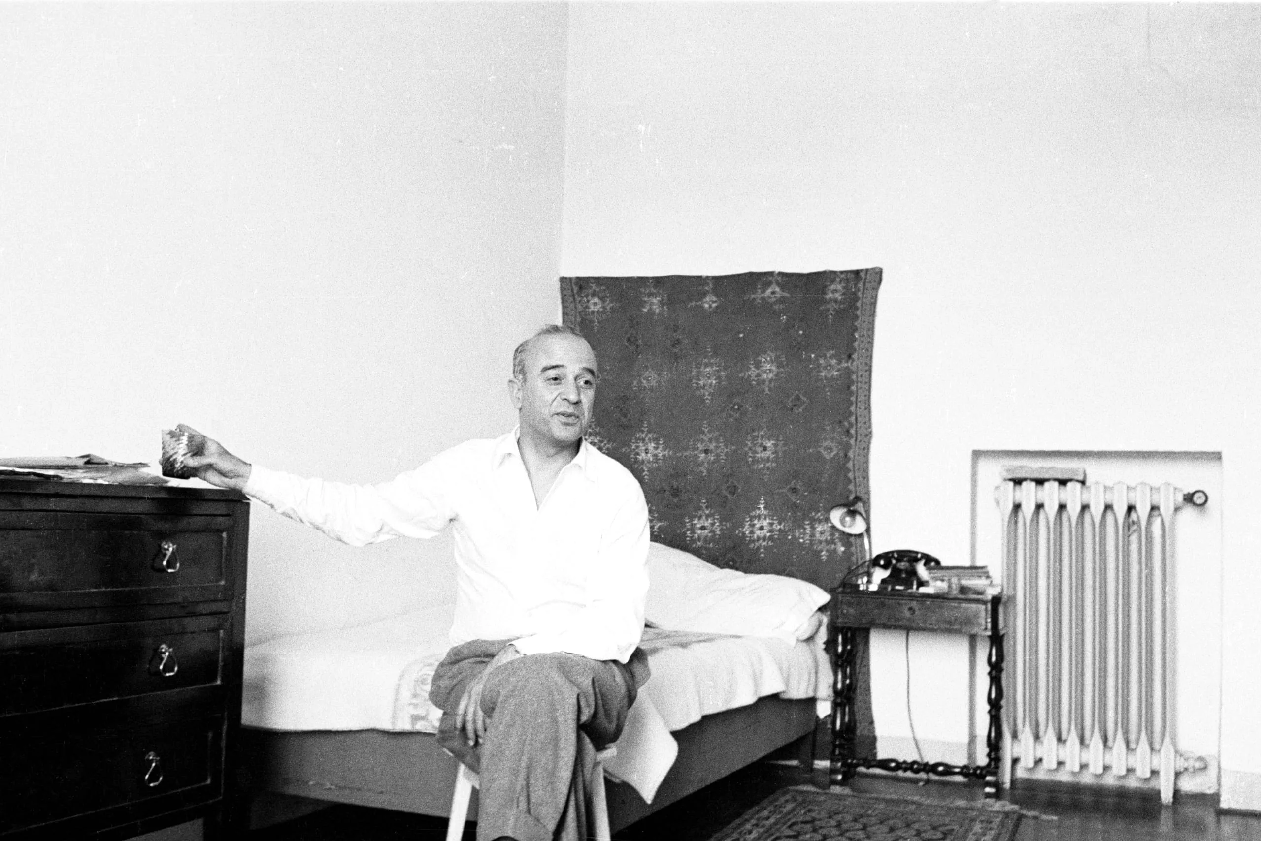 Black and white photograph of a bald, middle-aged man in a white shirt seated on a single bed, arm resting on a dark wood dresser, with a rotary telephone and radiator visible to the right