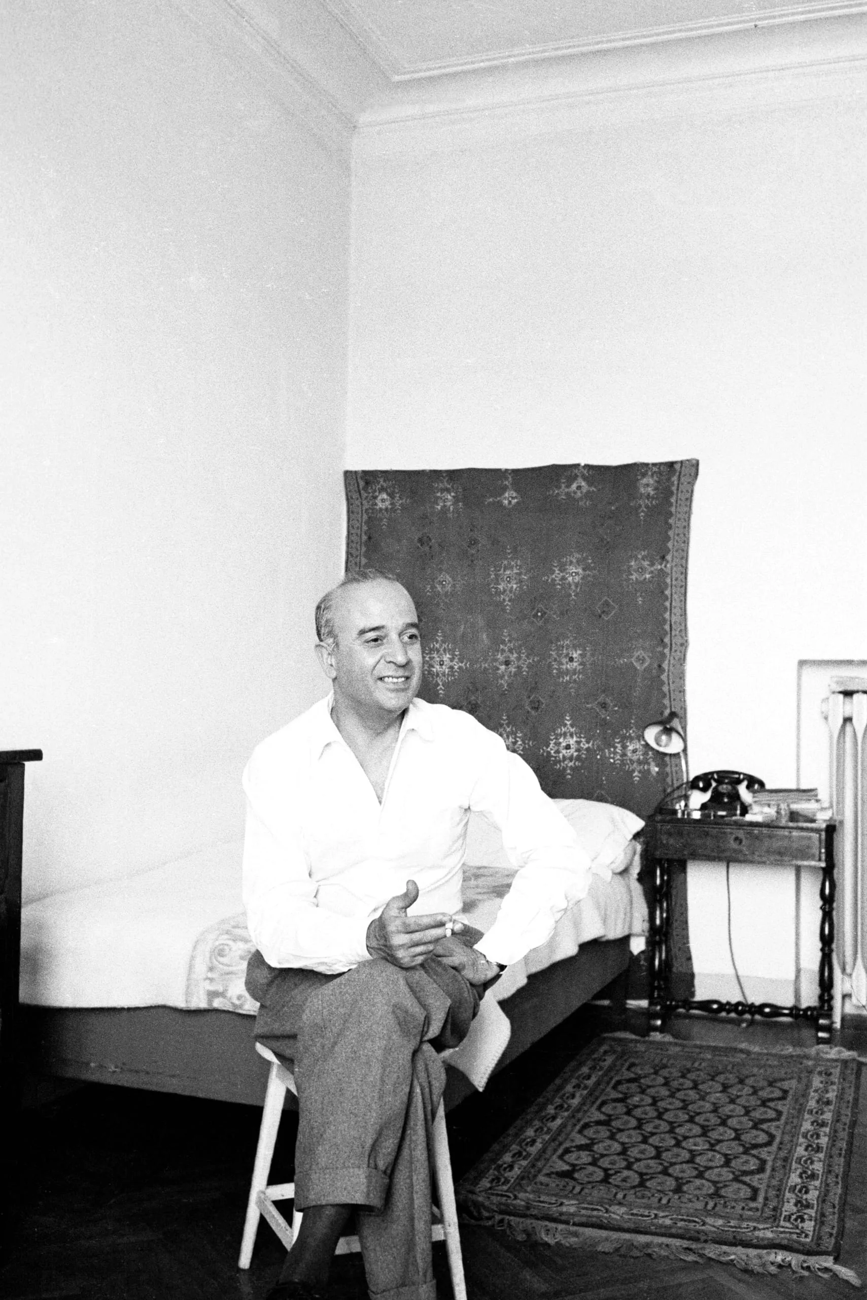 Black and white photograph of a man with brown skin seated on a stool in a bedroom, smiling, wearing a white open-collar shirt and gray trousers