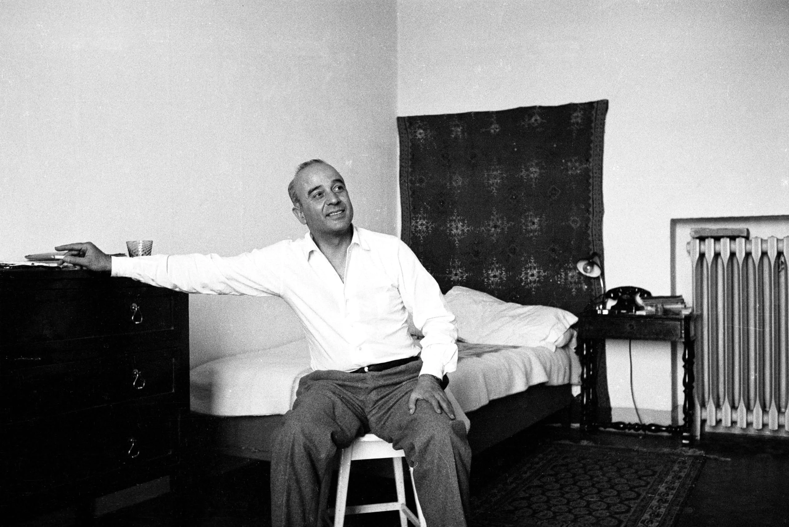 Black and white photograph of a man in a white shirt seated on a stool, arm outstretched to a dresser, head tilted back, in a sparsely furnished room