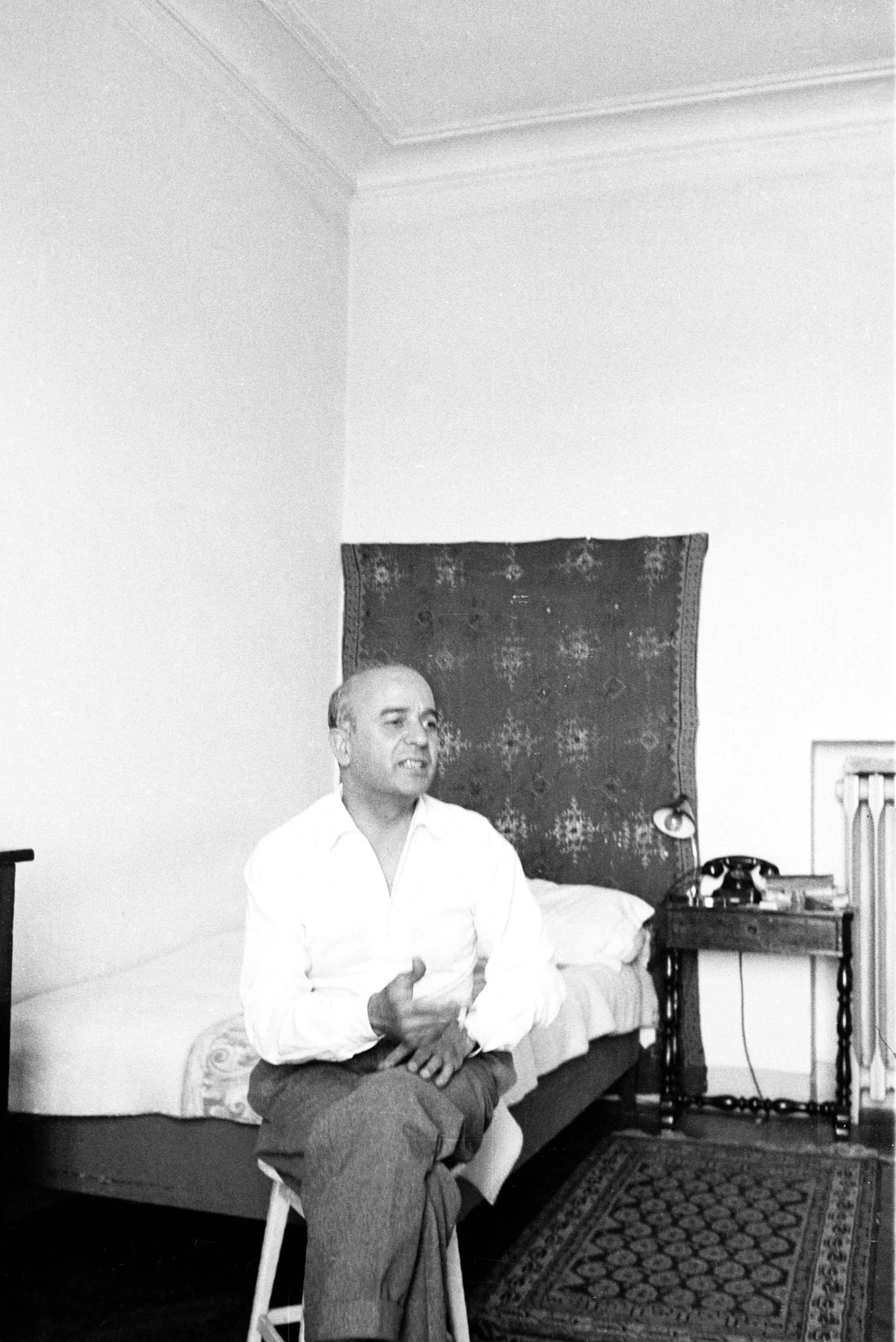 Black and white photograph of a man with a shaved head seated on a stool in a sparsely furnished room, hands clasped, looking to the right