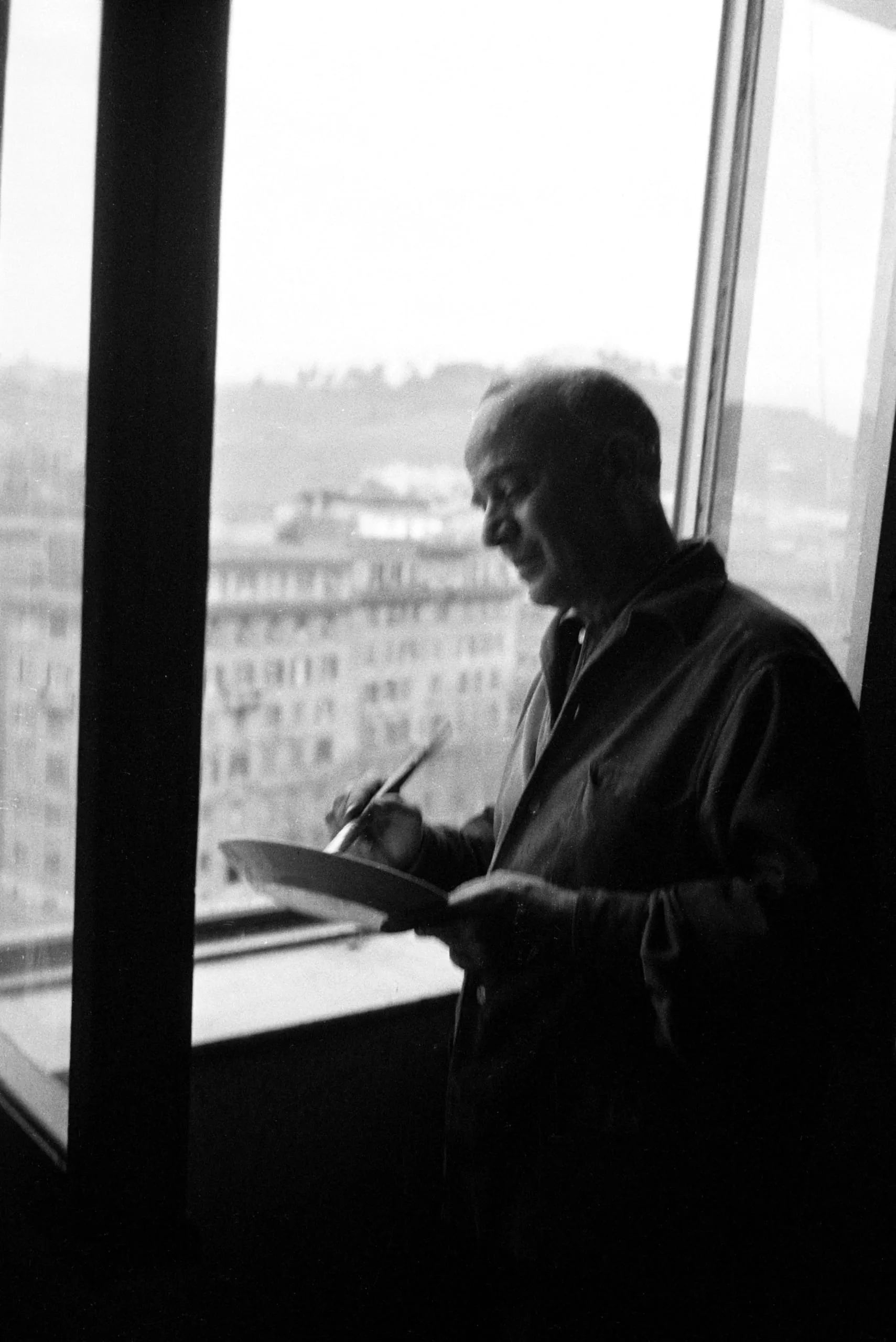 Black and white photograph, man in profile silhouetted against a large window, holding a plate and brush, with a city skyline visible outside