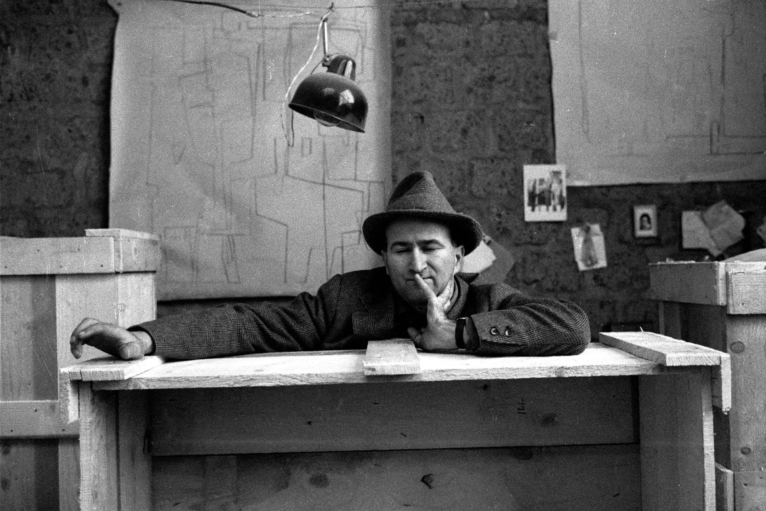 Black and white photograph of a man in a wide-brimmed felt hat leaning over a wooden crate in a studio, chin resting on his hand, sketched drawings visible on the wall behind him
