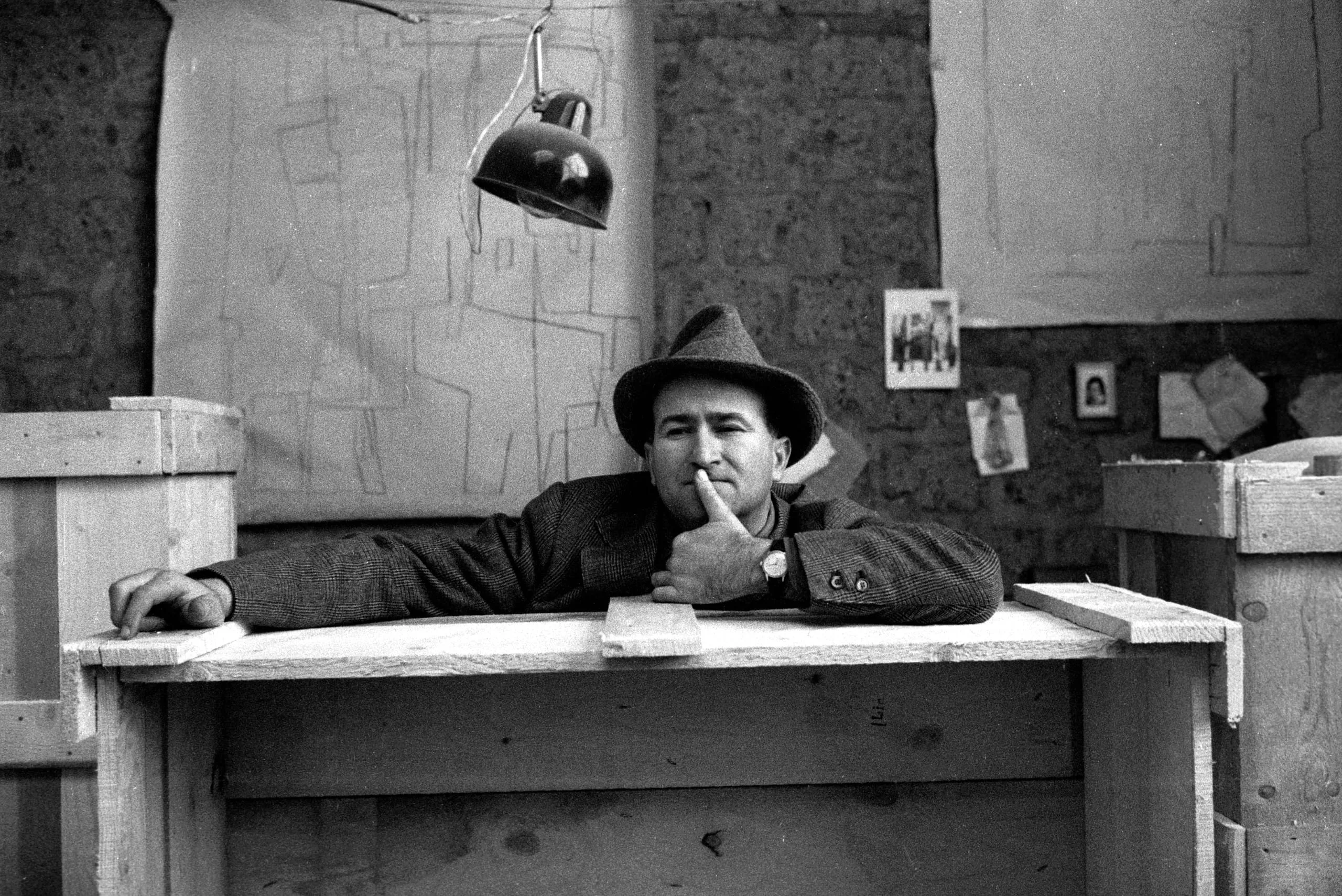 Black and white photograph of a man in a felt hat and tweed jacket leaning over a wooden crate in a studio, index finger raised to his lips, large sketch visible on wall behind him