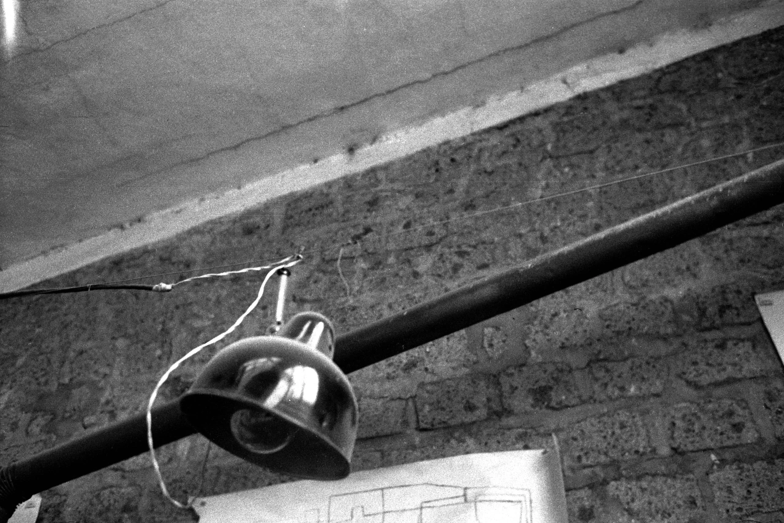 Black and white film photograph looking upward at a brick wall and concrete ceiling, with a dome-shaped desk lamp on an adjustable arm in the lower left