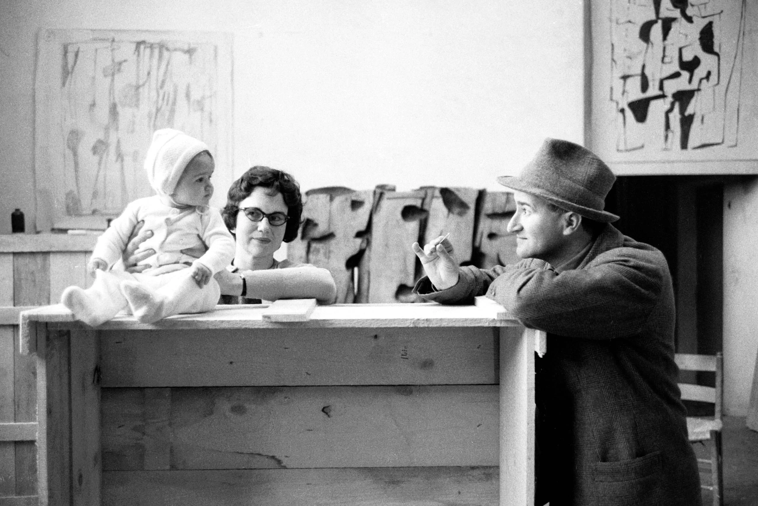 Black and white photograph of a baby, a woman with glasses, and a hatted man gathered around a worktable in an artist's studio, abstract paintings visible in the background