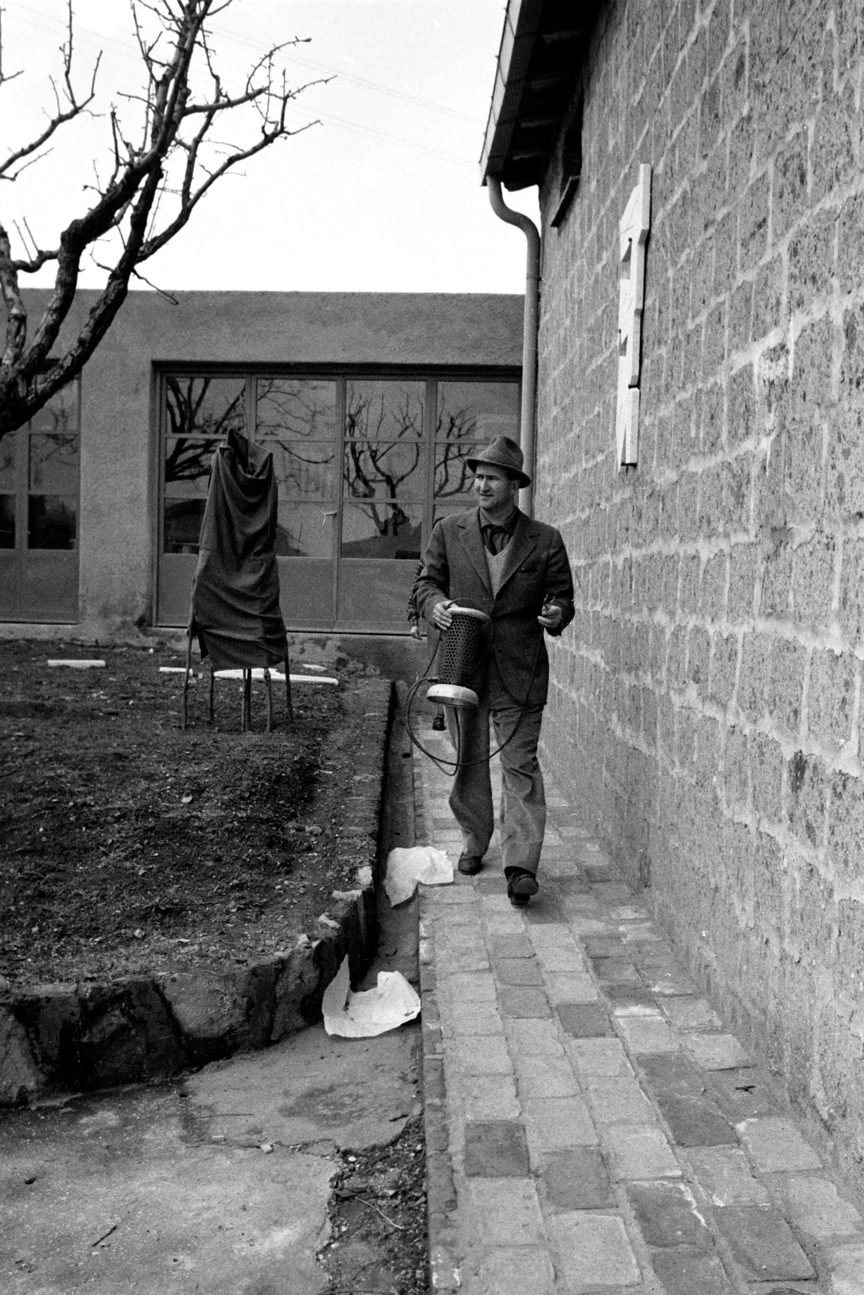 Black and white photograph of a man in a suit and hat walking along a brick path beside a rough stone wall, carrying a cylindrical mesh object