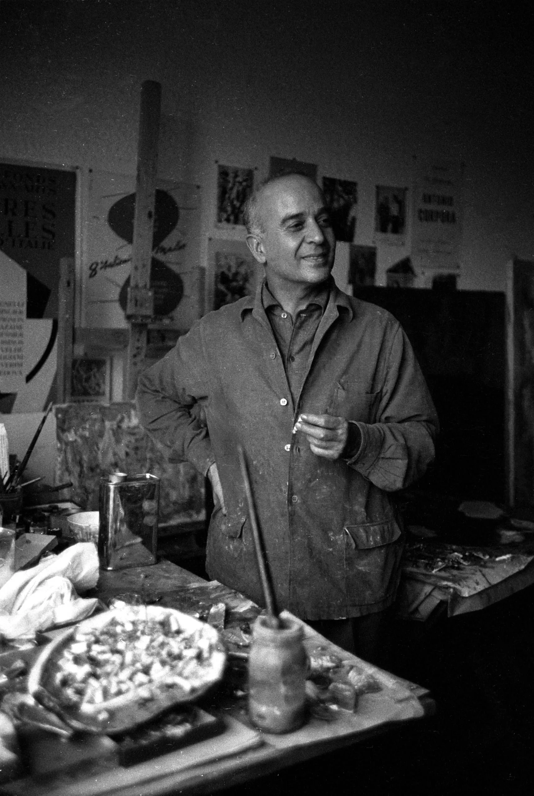 Black and white photograph of a man in a paint-stained work jacket standing in an artist's studio, smiling slightly, with a palette and art materials on a table in front of him and posters covering the wall behind