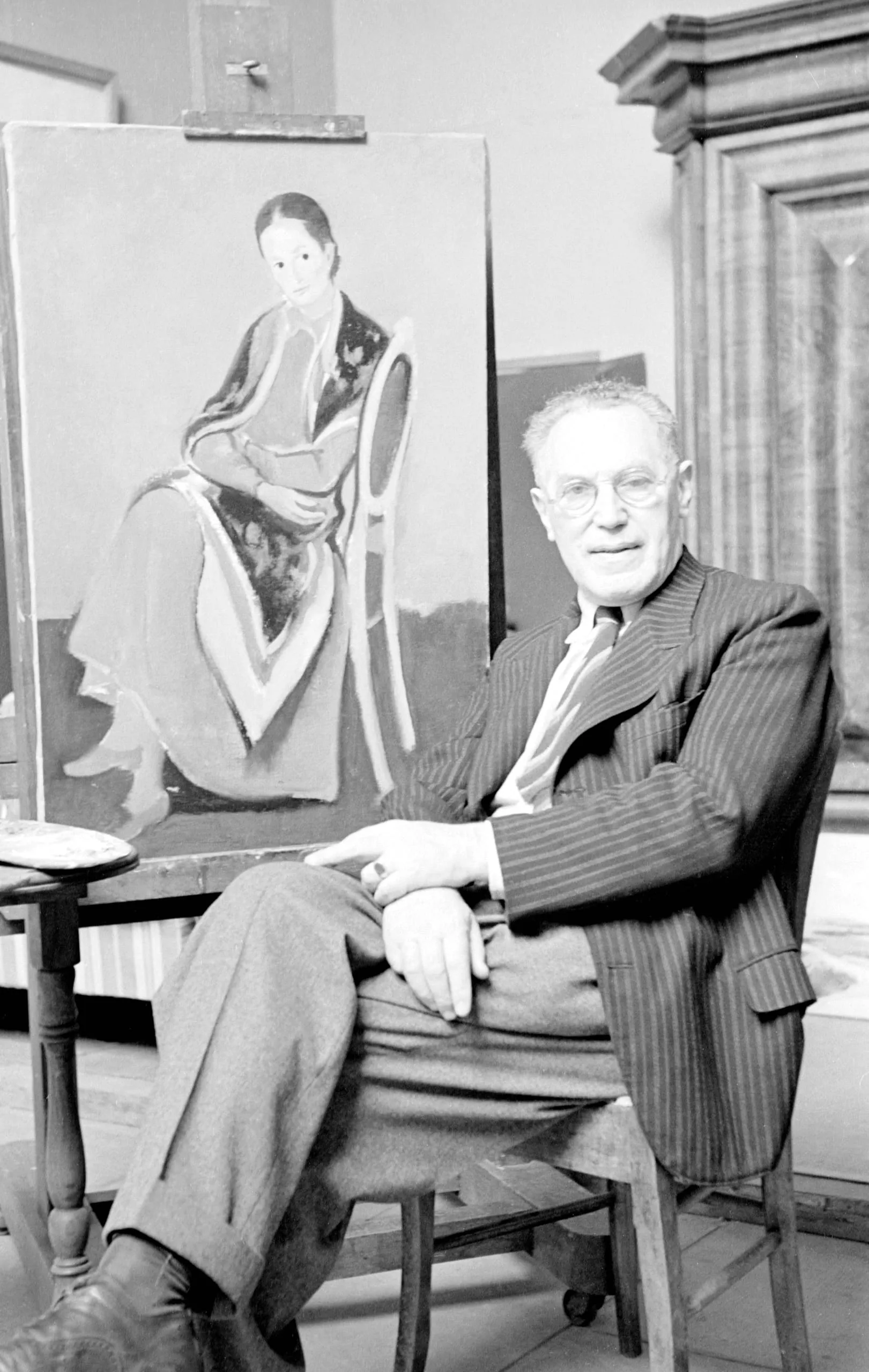 Black and white photograph of a white man in a pinstriped suit seated in a chair, with a large figurative painting on an easel behind him to the left