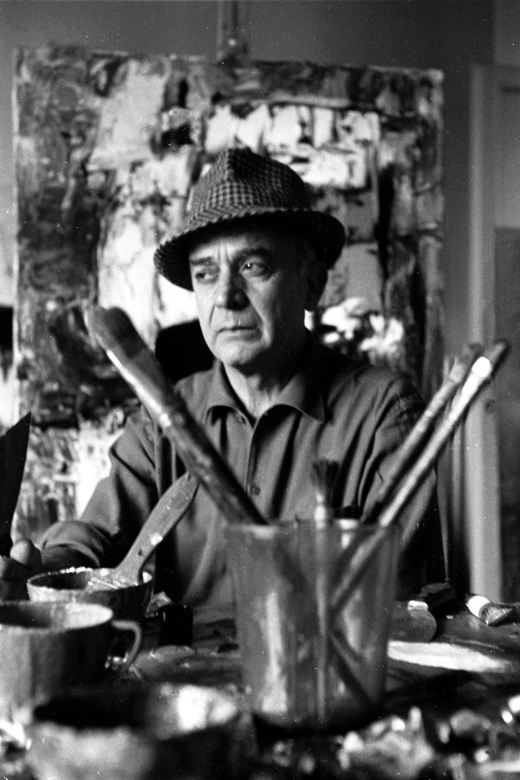 Black and white photograph of an older white man in a houndstooth hat seated at a worktable cluttered with paintbrushes and jars, an abstract canvas visible behind him