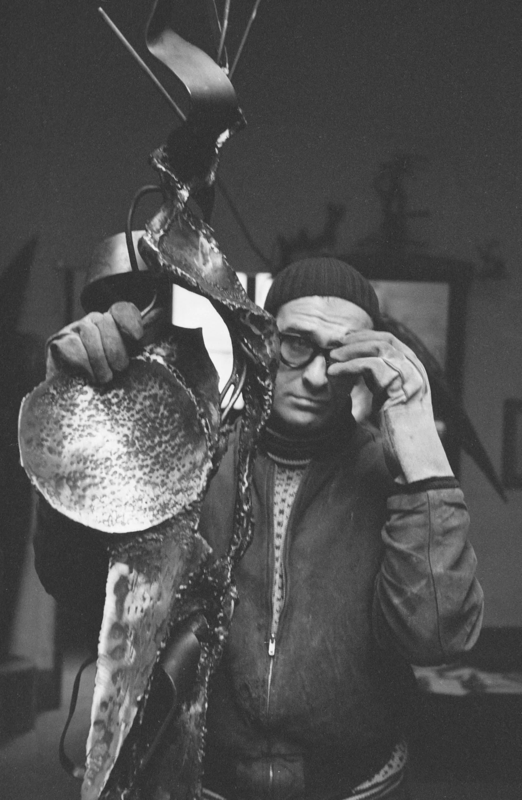Black and white photograph of a man in a knit cap and glasses standing beside a large welded metal sculpture, one hand gripping the work