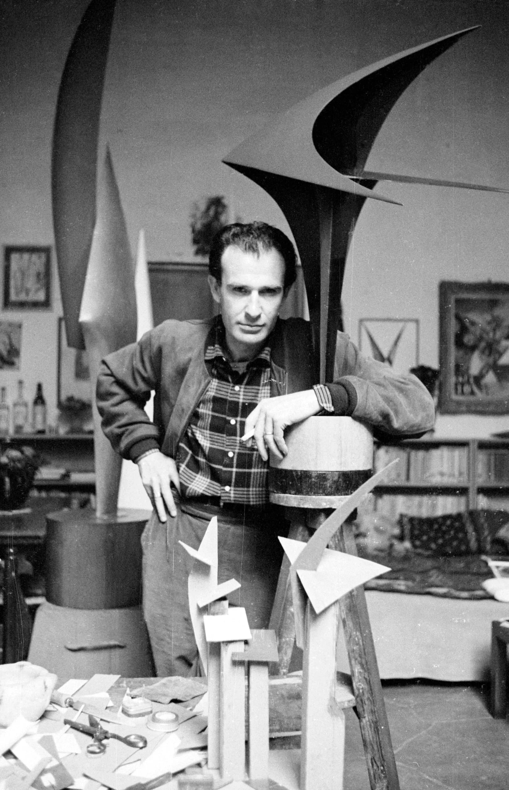 Black and white photograph of a dark-haired man in a plaid shirt leaning over a worktable in an artist's studio, surrounded by abstract sculptural forms with sweeping blade-like shapes