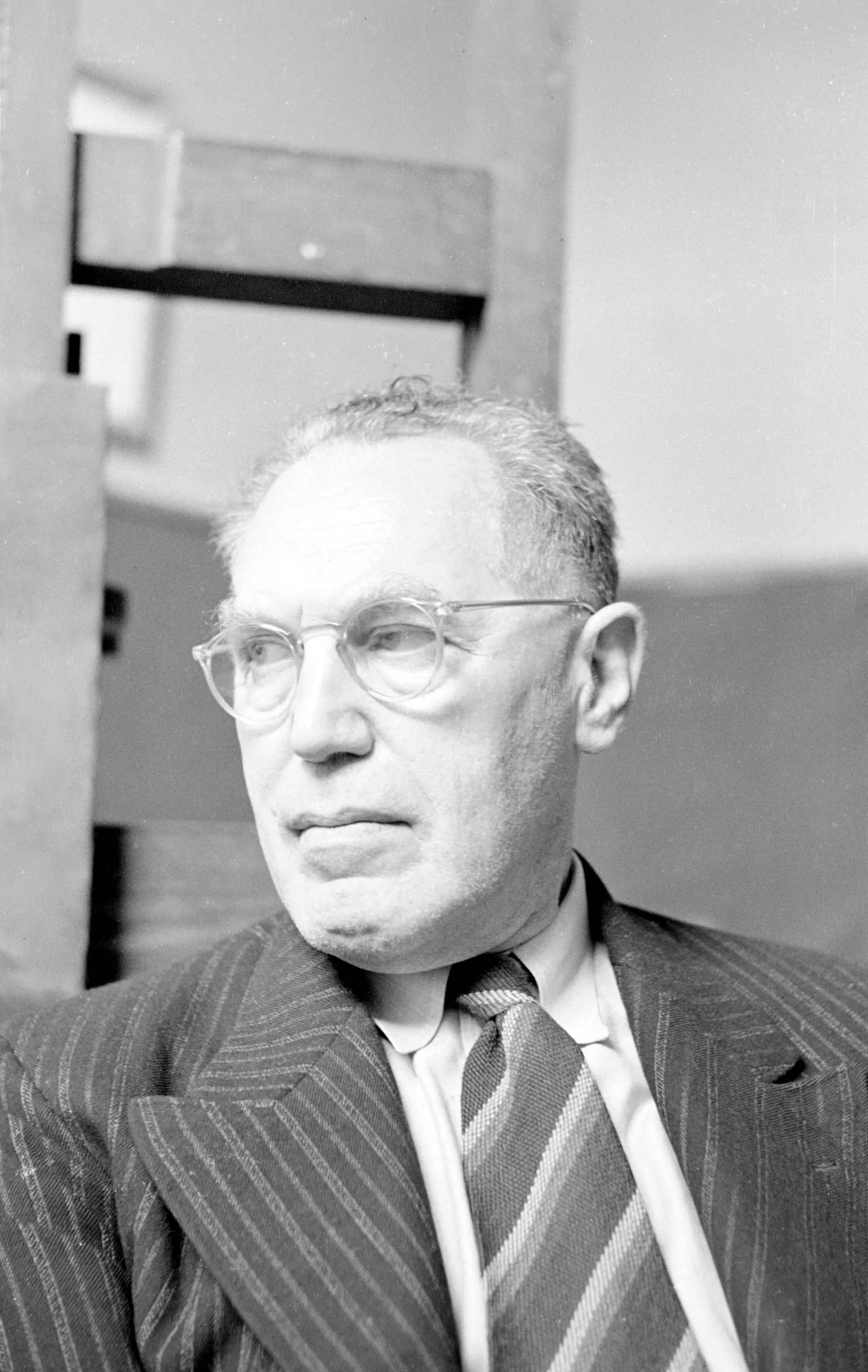 Black and white photograph, chest-up portrait of a white man in wire-rimmed glasses, pinstripe suit, and striped tie, body angled right, gaze to the left