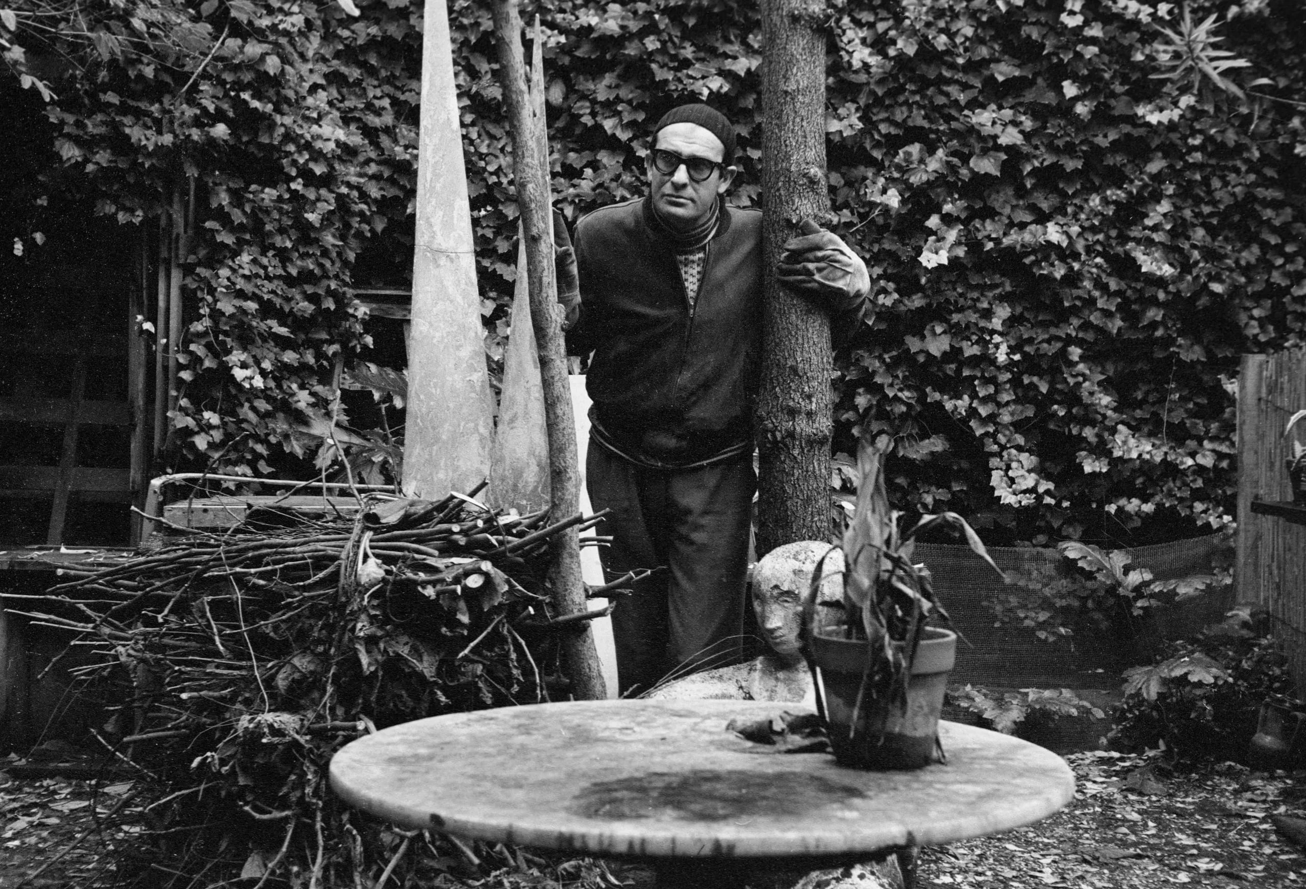 Black and white photograph of a man in glasses and a dark sweater leaning against a tree trunk in a cluttered garden, with a round stone table in the foreground