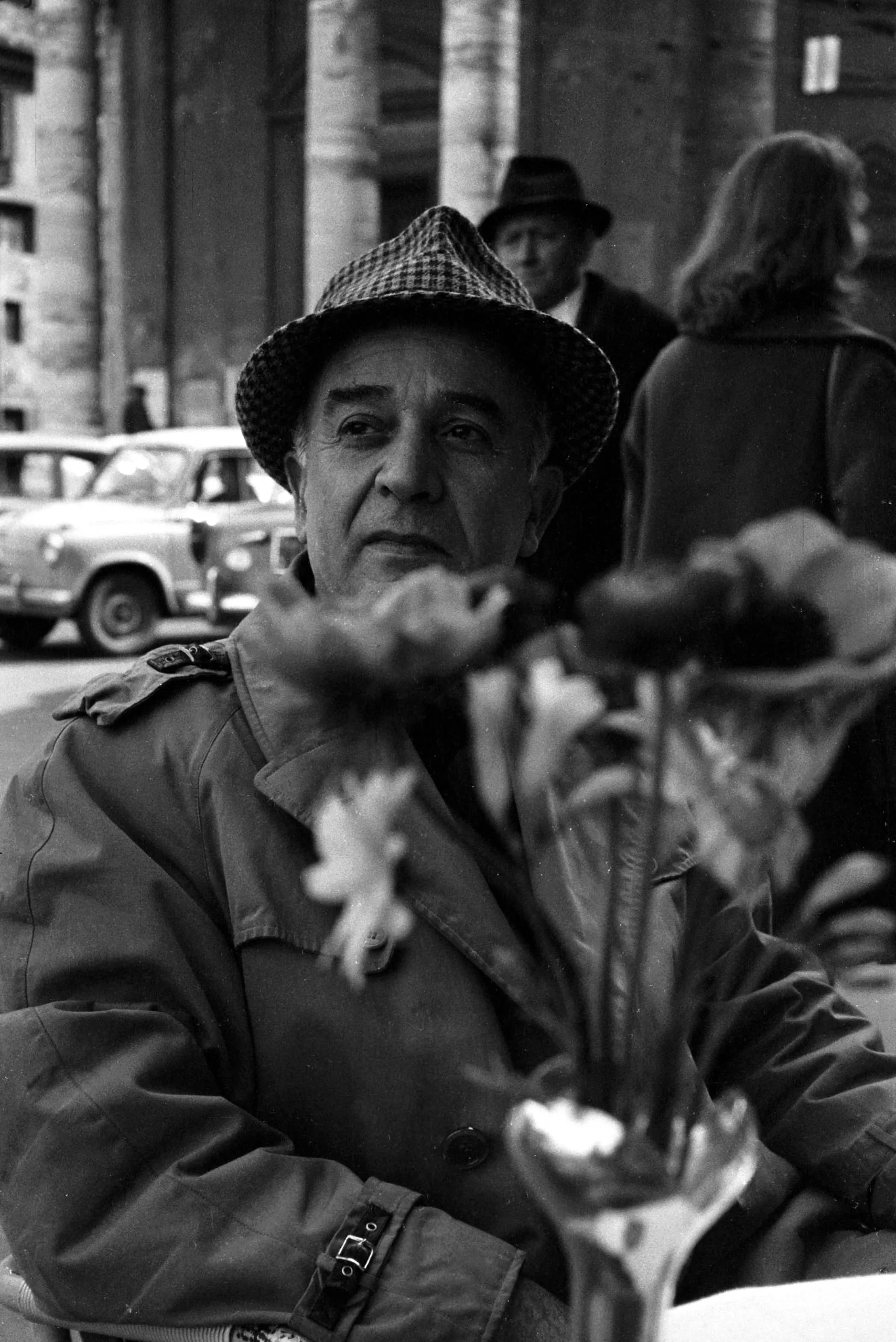 Black and white photograph, middle-aged man in houndstooth fedora and trench coat seated behind an out-of-focus vase of flowers on a city street