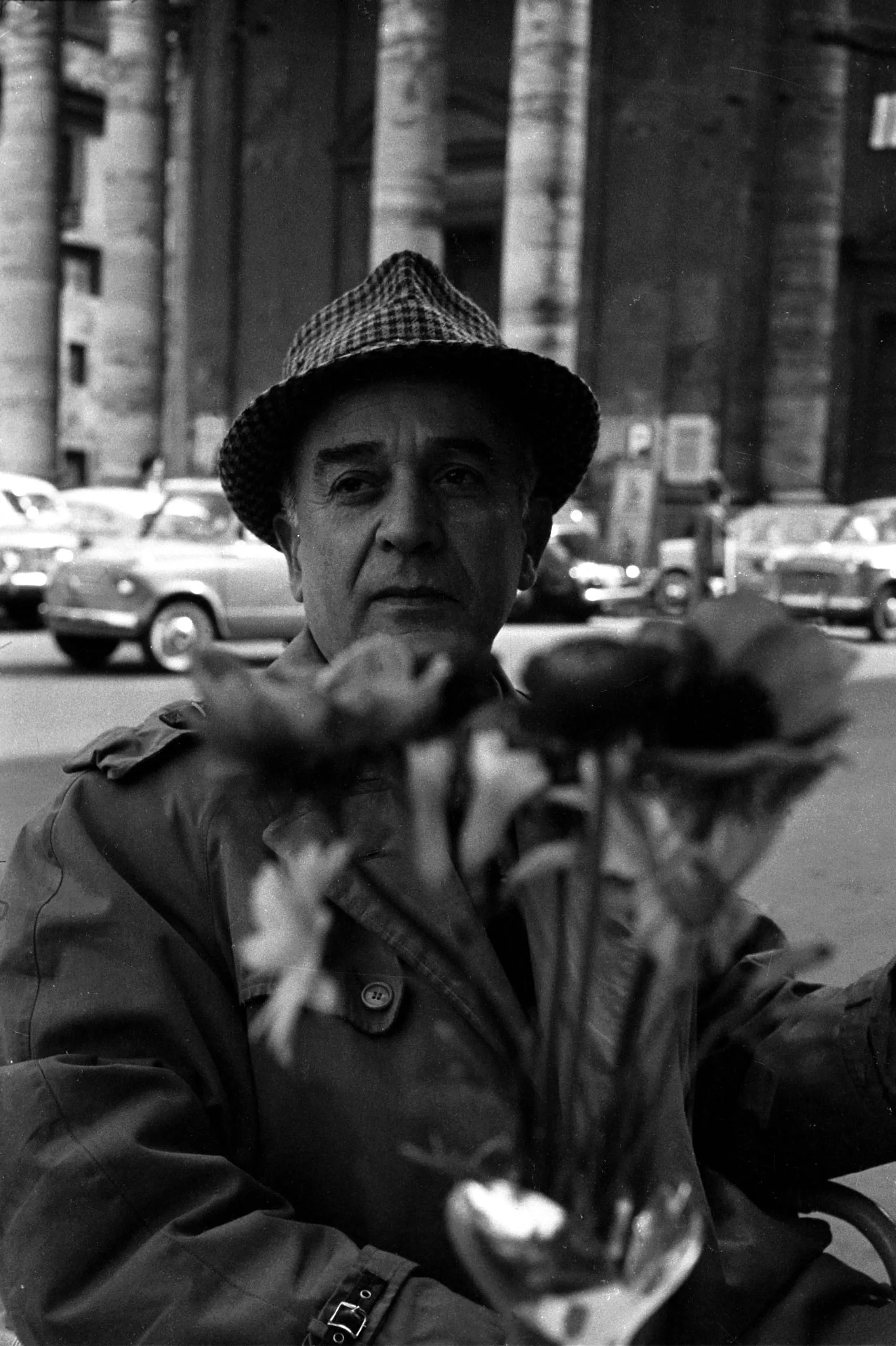 Black and white photograph of a man in a houndstooth hat holding a bouquet of flowers toward the camera, with large stone columns and vintage cars in the background