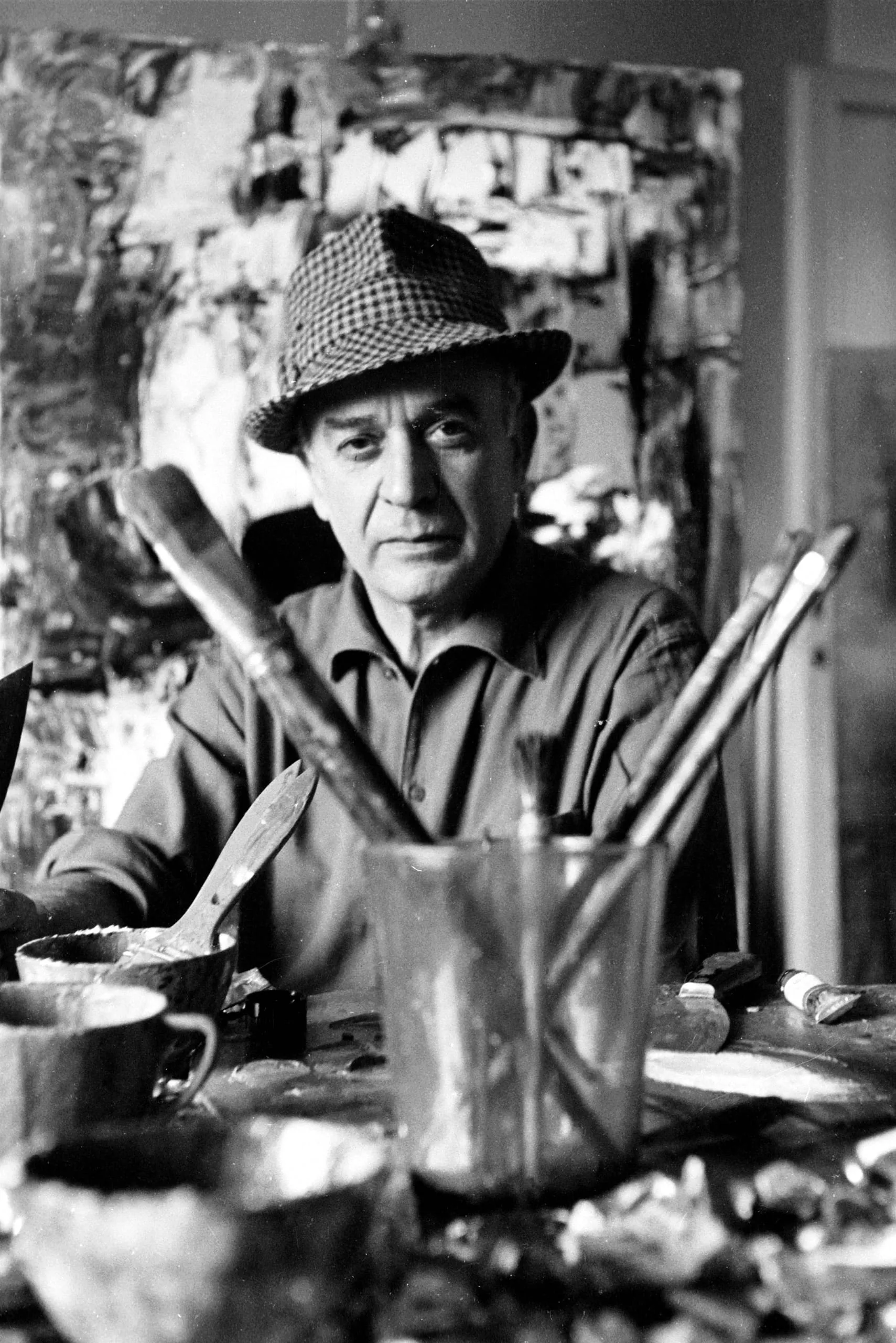 Black and white photograph, white man in houndstooth fedora seated behind a paint-covered worktable holding brushes and palette knives, abstract canvas visible behind him