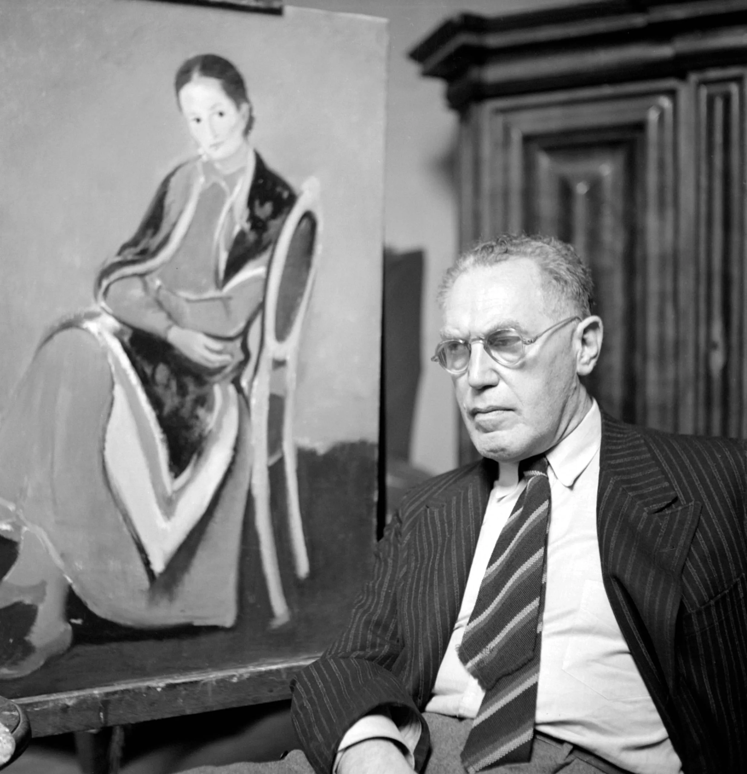 Black and white photograph of a gray-haired white man in a pinstriped suit seated beside a figurative painting on an easel, looking downward