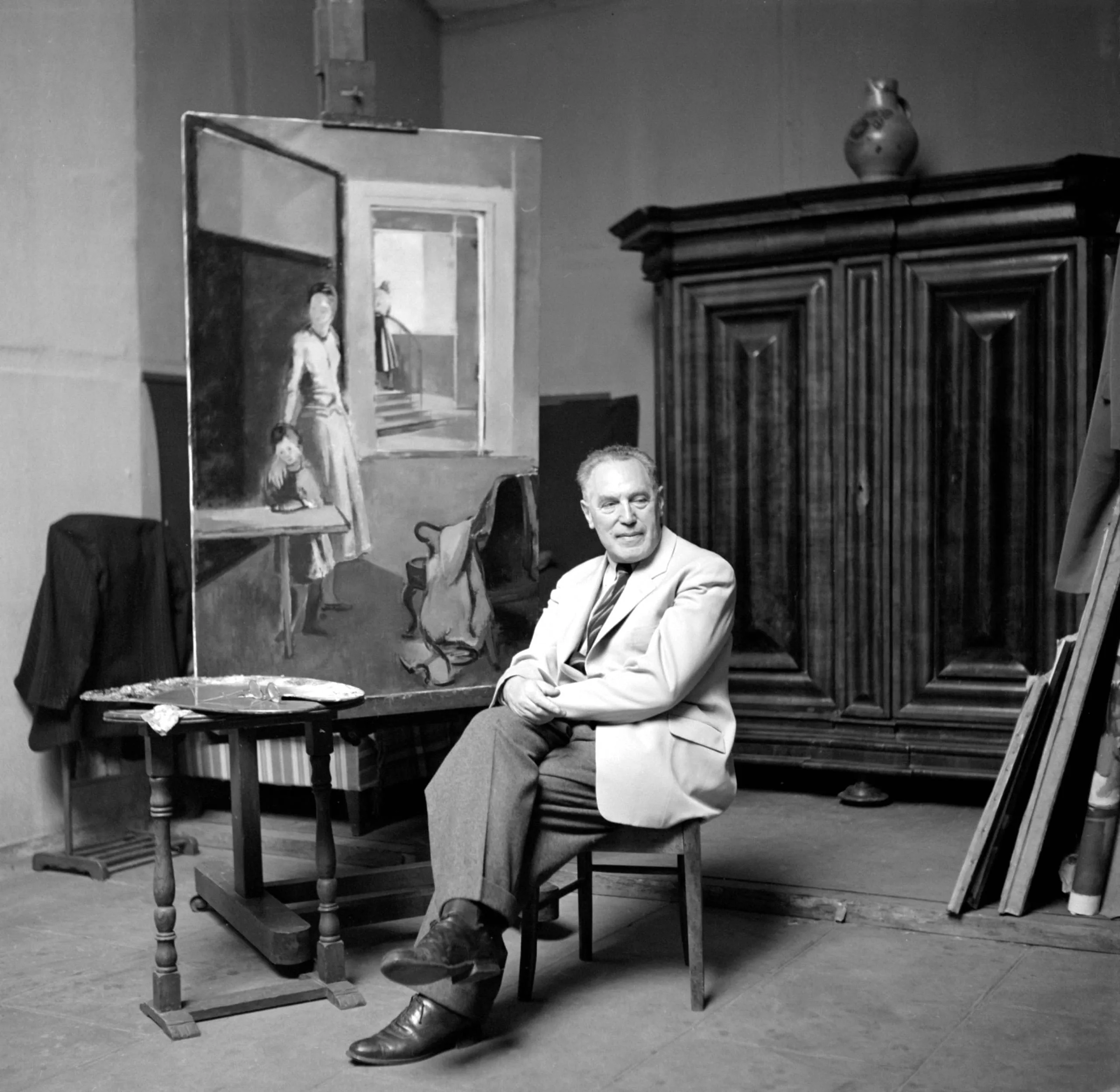 Black and white photograph of a man in a blazer seated in an artist's studio beside a large easel painting of an interior scene