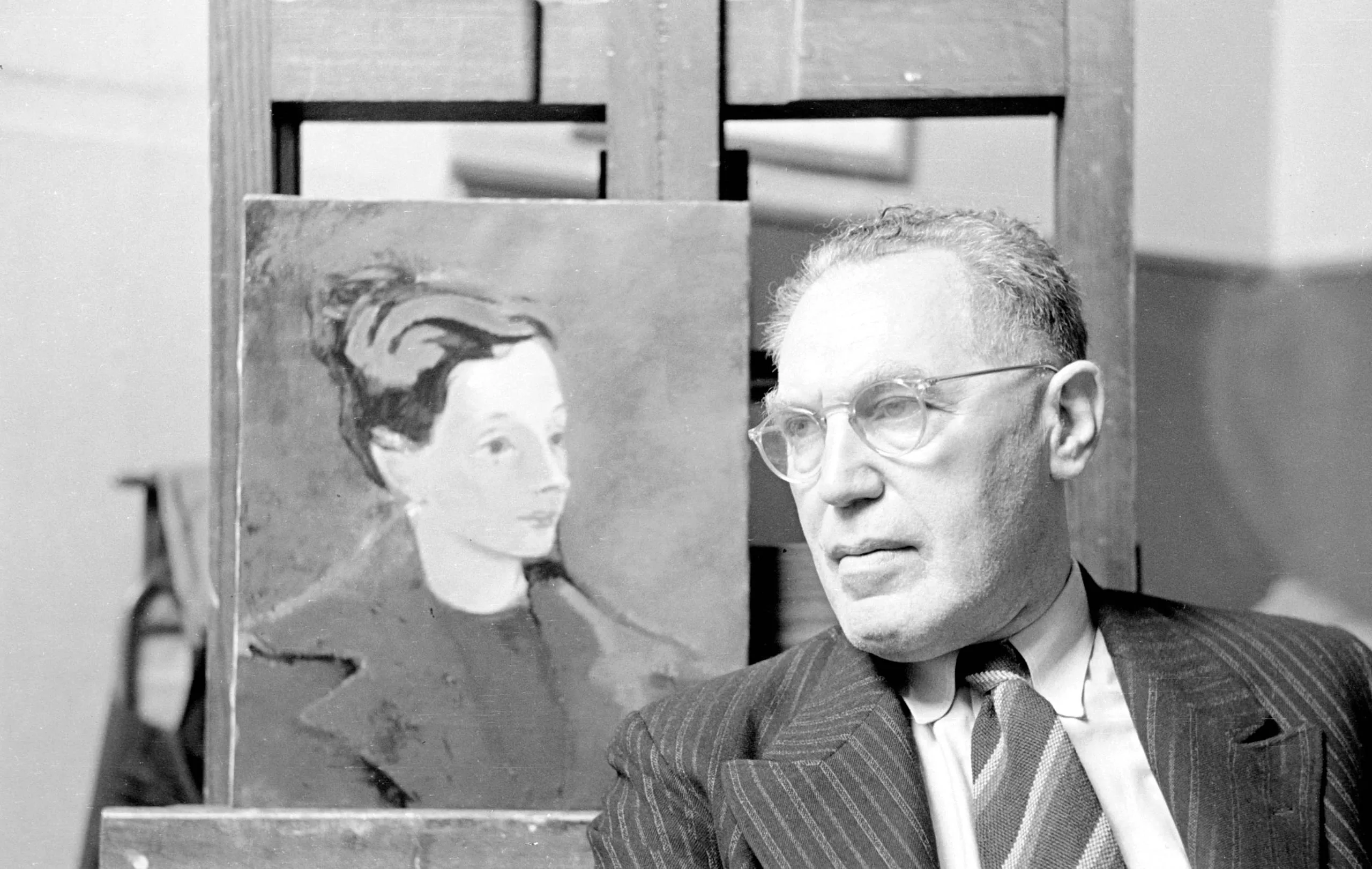 Black and white photograph of a man in a pinstriped suit seated beside a painted portrait of a woman on a wooden easel