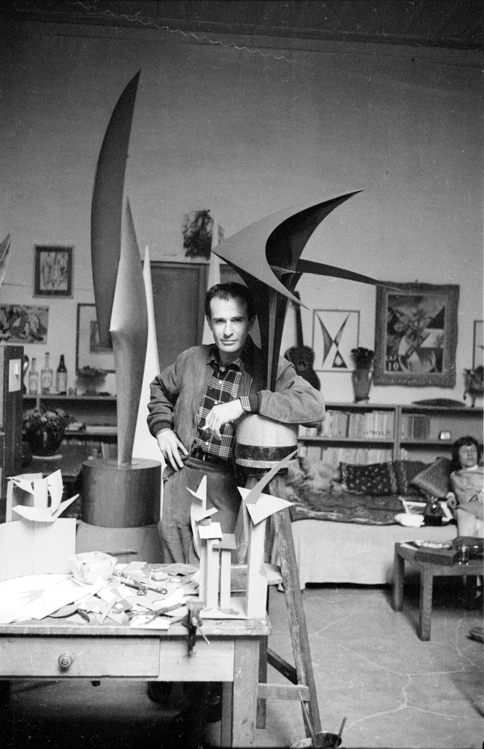 Black and white photograph of a man leaning over a tall abstract sculpture with blade-like forms in a cluttered artist's studio