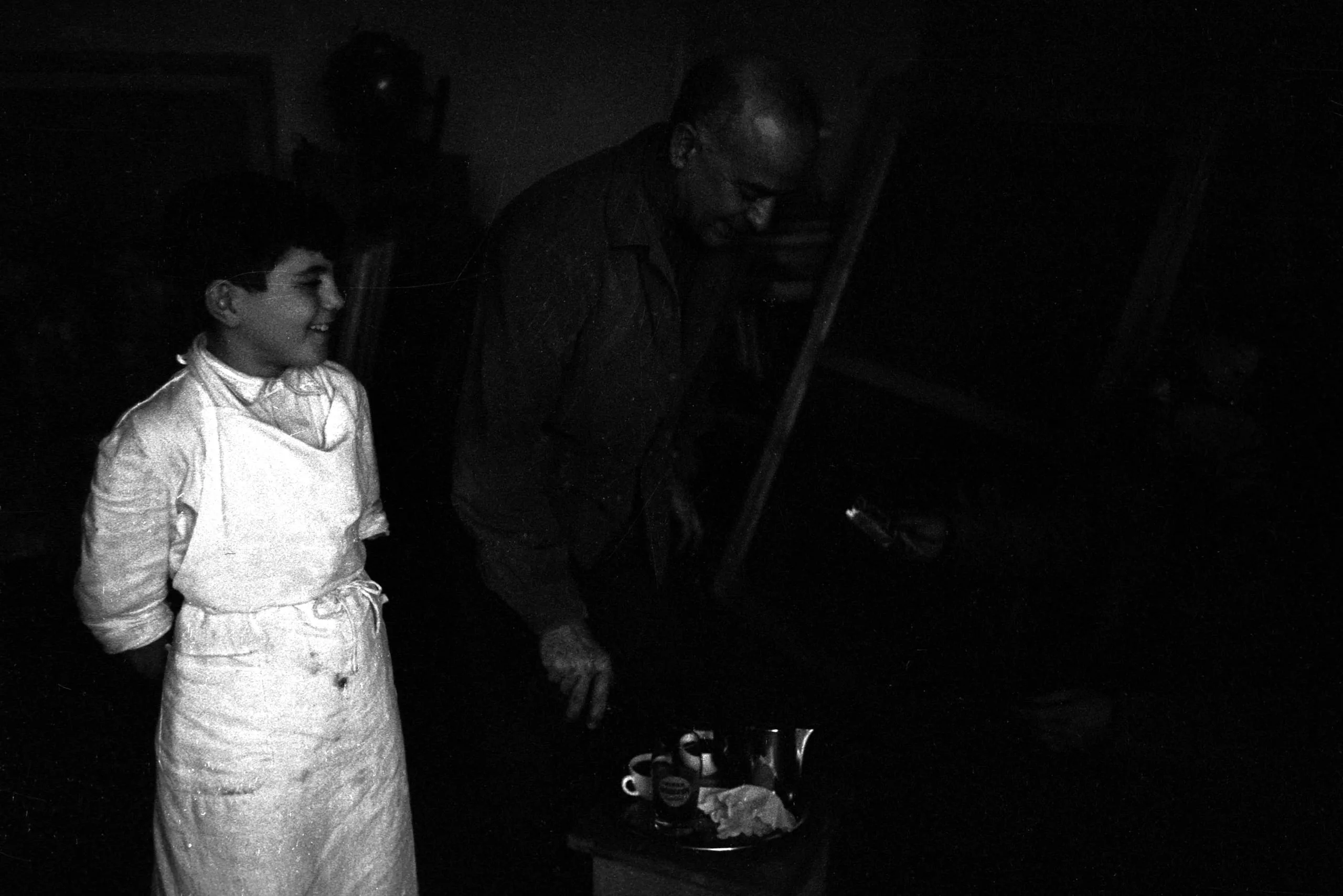 Black and white photograph, a smiling child in a stained white apron stands beside a tall man leaning over a tray of small objects in a darkened room