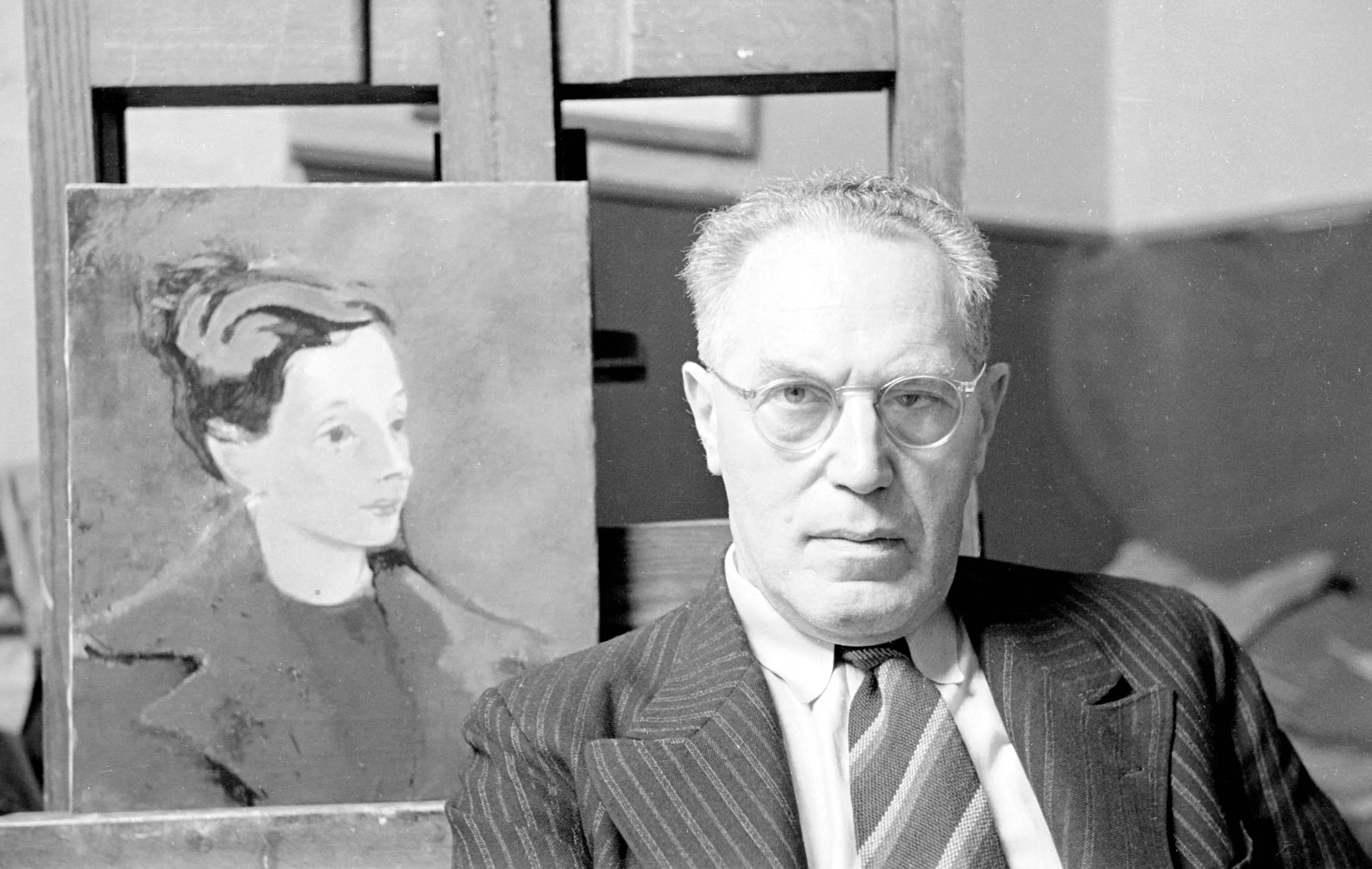 Black and white photograph of a man in a pinstriped suit and round glasses, seated beside a painted portrait of a woman on an easel