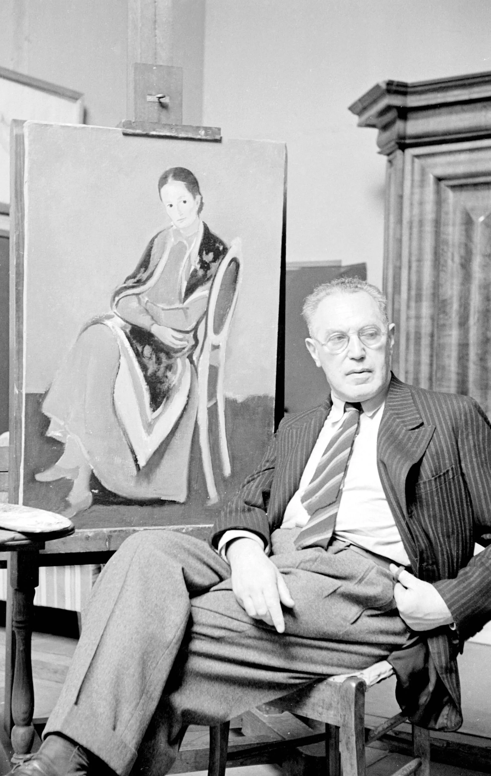 Black and white photograph of a white man in a pinstriped suit seated in a studio chair beside an easel holding a painted portrait of a seated woman