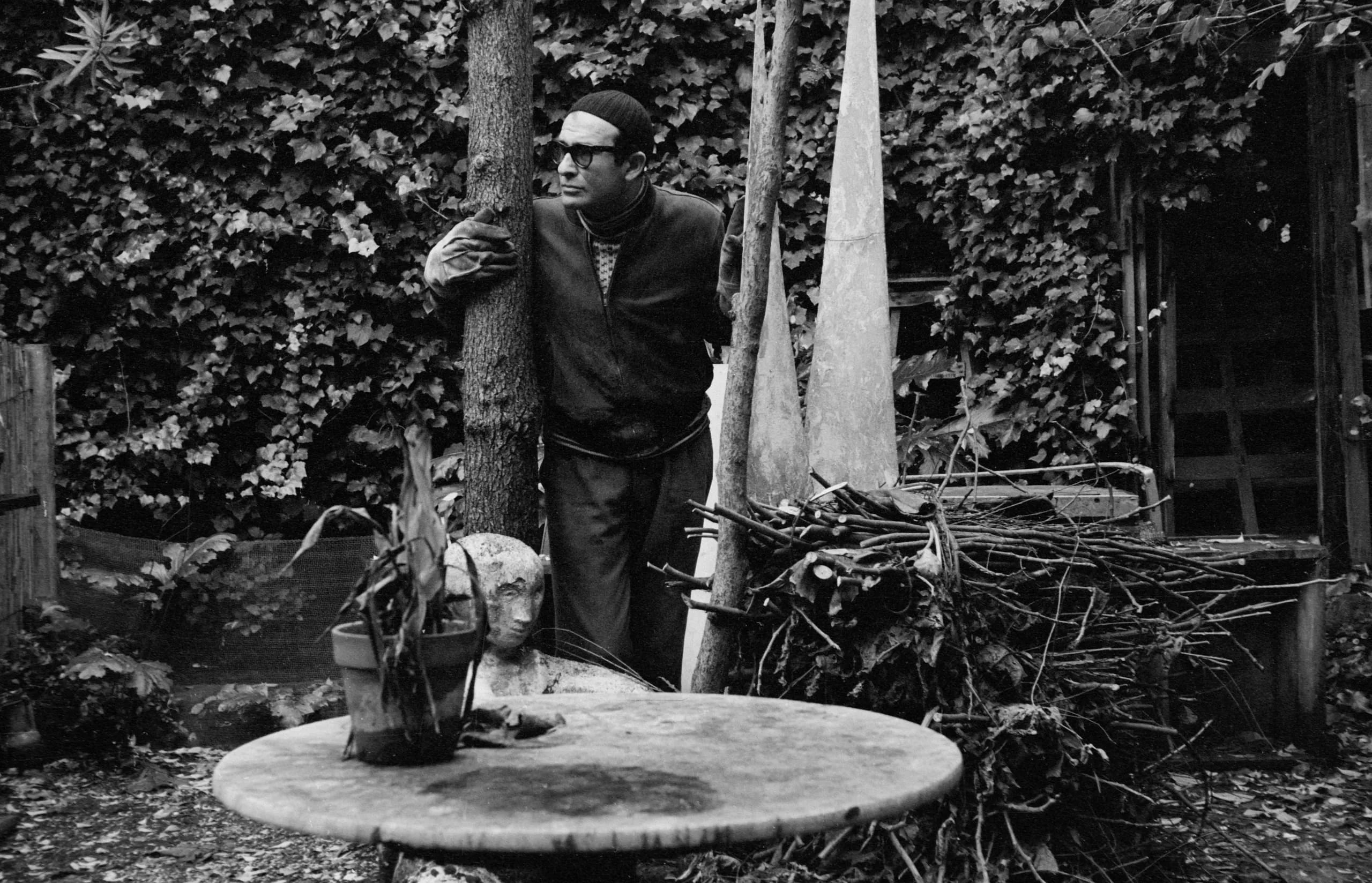 Black and white photograph of a man in dark clothing and glasses leaning against a tree trunk in an ivy-covered garden, with a sculptural head and potted plant on a round table in the foreground