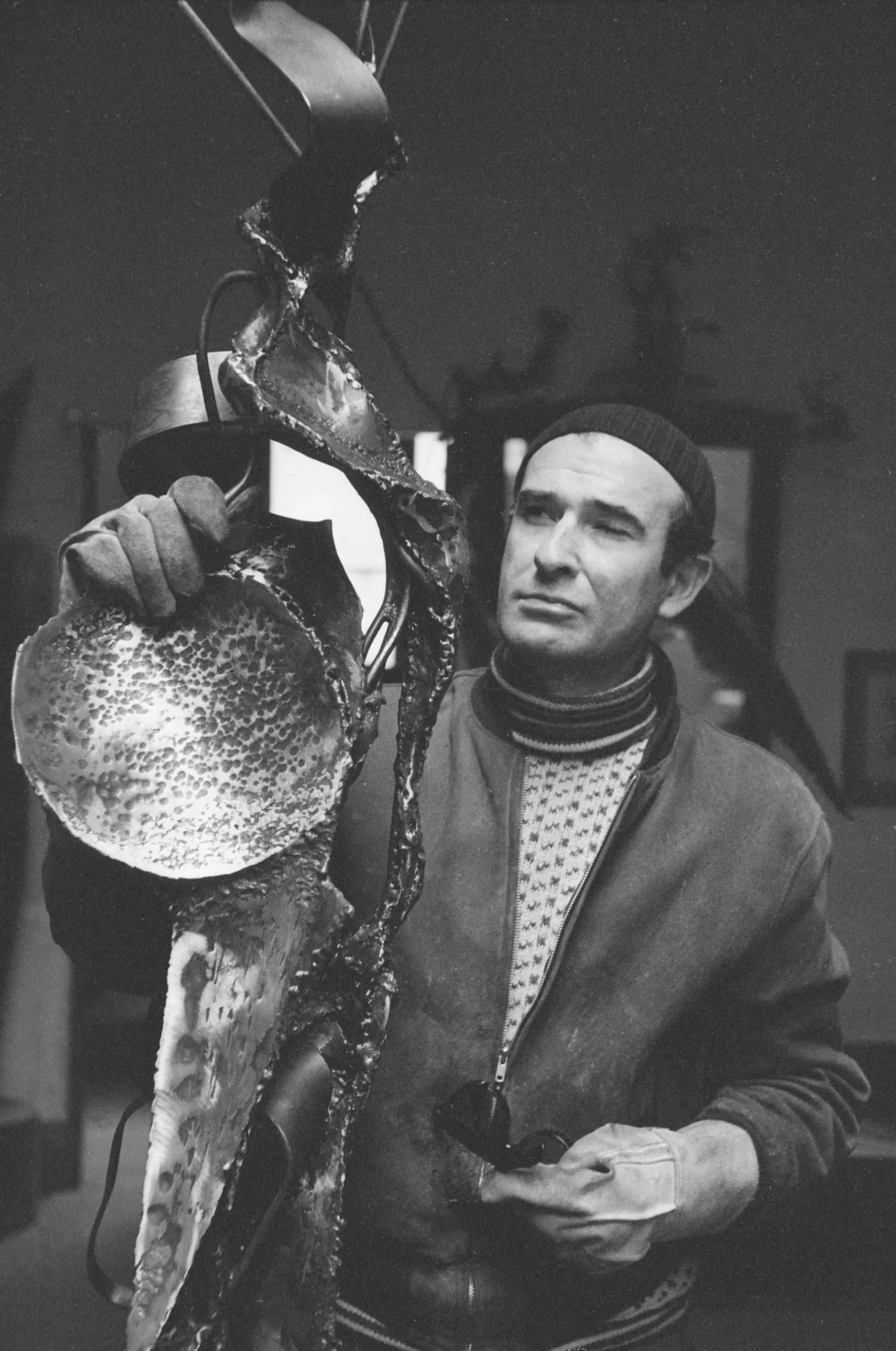 Black and white photograph of a man in a knit cap and turtleneck sweater holding a large, heavily textured metal sculpture with a broad concave bowl form