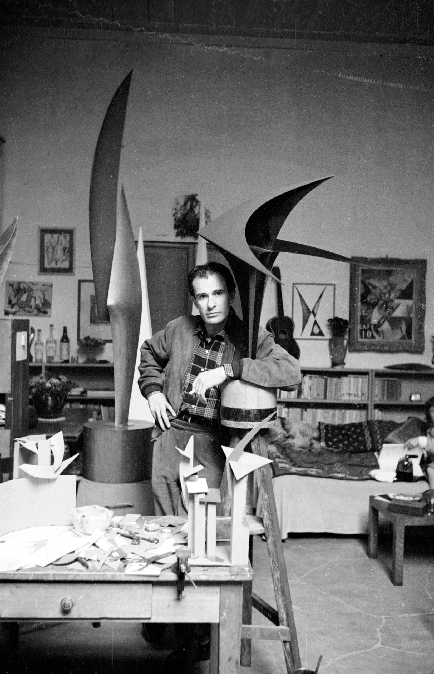 Black and white photograph of a man in a plaid shirt standing among tall, blade-like abstract sculptures in an artist's studio